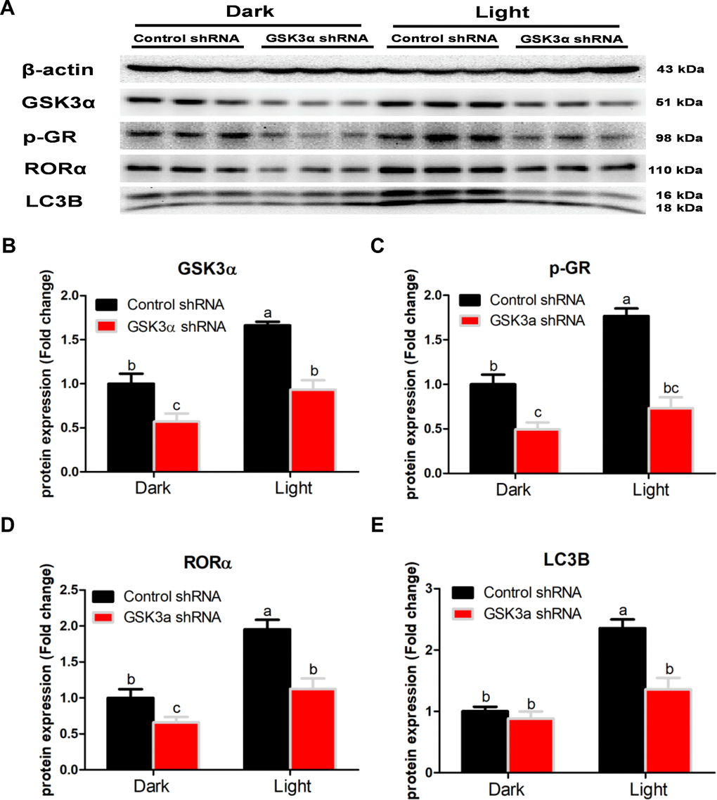 GSK-3 is a multifunctional kinase with a critical role in the regulation of autophagy. Previous studies reported that inhibition of GSK-3 activates autophagy in human pancreatic cancer cells [27], breast tumor cell line MCF7 [28], and prostate cancer cells [29]. Contradictory findings are also reported that inhibition of GSK-3β suppresses autophagic cell death in adult hippocampal neural stem cells [26]. The kinase activity of GSK-3 is inhibited through phosphorylation of a serine residue located at the N-terminus of the proteins, S21 and S9 of GSK-3α and GSK-3β, respectively [30]. In the present study, the protein expression of total GSK-3α and GSK-3β was significantly increased, while that of phosphor-GSK-3α (Ser9) and phosphor-GSK-3β (Ser9) was decreased in response to white LED light exposure, indicating enhanced GSK-3 activity. Inhibition of GSK-3 with CHIR-99021 or shRNA was able to rescue the LED light-induced cell autophagy associated with normalized protein expression of LC3B and Beclin. Interestingly, CHIR-99021 and GSK-3α shRNA also restored the protein expression of phospho-GR and RORα, while light-induced GSK activation was not normalized by RORα or GR inhibition. These results imply that GSK is up-stream of GR and RORα activation induced by white LED light exposure. Our findings are consistent with a previous study that GSK-3 phosphorylates GR on Ser404 and promotes GR activity [42].