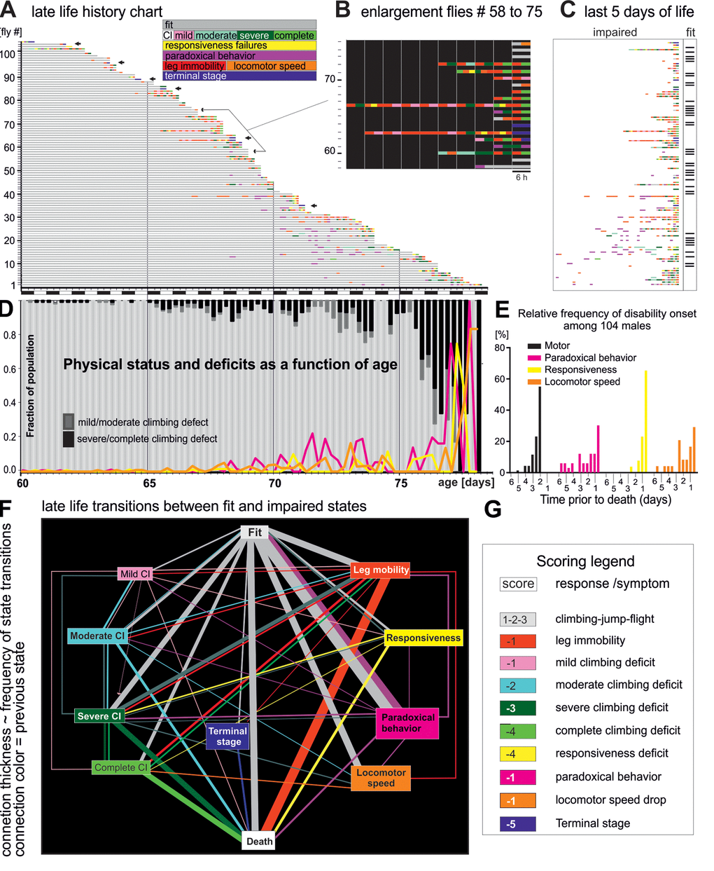 For comprehensive visualization all physical state transitions were plotted as ethogram (Figure 1F). The thickness of each state-connecting line represents the percentage of flies showing that transition, and line colors demark the state prior to a transition. One third of all flies died without any impairment until the last trial before death (vertical “fit to death” transition). The most common transitions from fitness to pre-death impairments were (i) to paradoxical behavior (magenta box, reversible), (ii) leg immobility (red box, irreversible), (iii) locomotor speed (orange box, irreversible) and (iv) severe/complete climbing impairments (green boxes). Severe and complete climbing inabilities were usually not the end-product of gradually worsening mild or moderate defects, but mostly occurred suddenly and were almost always persistent. By contrast, milder climbing defects occurred recurrently. Paradoxical behavior occurred sporadically and rarely directly preceded another impairment or death.