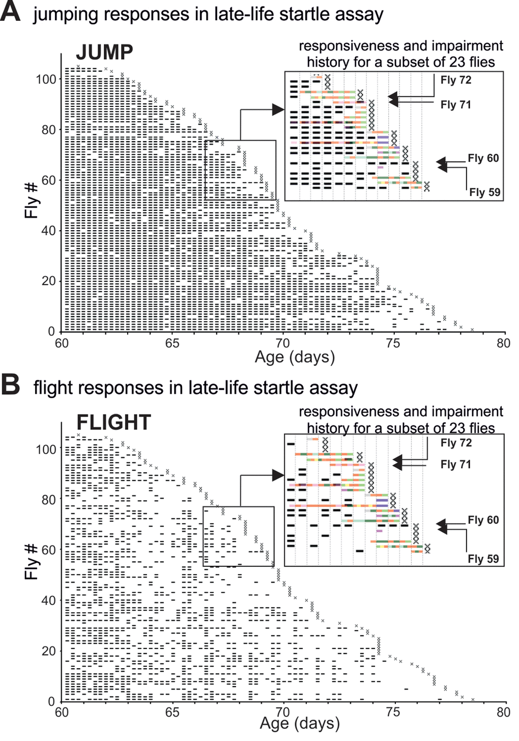 Toward addressing this issue we have characterized onset and progression dynamics of Drosophila age-dependent motor pathophysiology in longitudinal studies. We found age-related decline in motor performance and characterized specific late-life motor disabilities. Flies either escape disability until few hours prior to death (wellderlies/escapers) and die rapidly, or disability may be manifested and accumulating for days prior to death (illderlies/delayer). Both, escapers and delayers exhibit stereotypic patterns of functional collapse during the last ~3 hours prior to death. Moreover, late-life quality is highly variable because onset, duration, severity, and progression dynamics of decline are heterogenic, largely independent of age at death, and characterized by both, progressive worsening and sudden late-life events. Therefore, Drosophila late-life motor pathophysiology bears similarities to what has been reported for humans (see discussion).