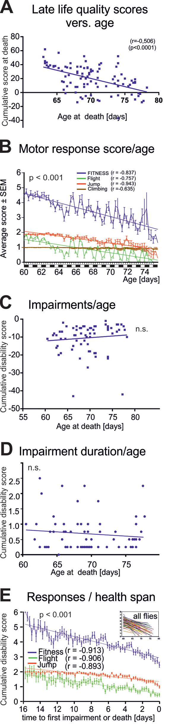 Overall late-life quality was assessed for each fly by a cumulative score during the last three days of life. Late-life quality showed a significant negative correlation to the age at death (Figure 3A, p < 0.001, Pearson r test). This could either be caused by a decline in the intensity of healthy motor responses, or by cumulating disabilities, or both. Separating healthy motor performance (positive scores) from impairments (negative scores) revealed a significant decline in motor performance intensity with age (Figure 3B, blue line). Older flies responded less often with jumping or flying (Figure 3B, green line flight, red line jump), whereas the frequency of climbing responses remained more stable until death (Figure 3B, brown line). The fluctuations along the steadily declining performance scores with age were due to the light/dark cycle (Figure 3B). By contrast, neither disability scores reflecting the severity of motor defects (Figure 3C, r = 0.1021 p = 0.4002, Pearson test), nor the duration of ill-span (Figure 3D, r = -0.011, p>0.2, Pearson test) increased significantly with age at death.