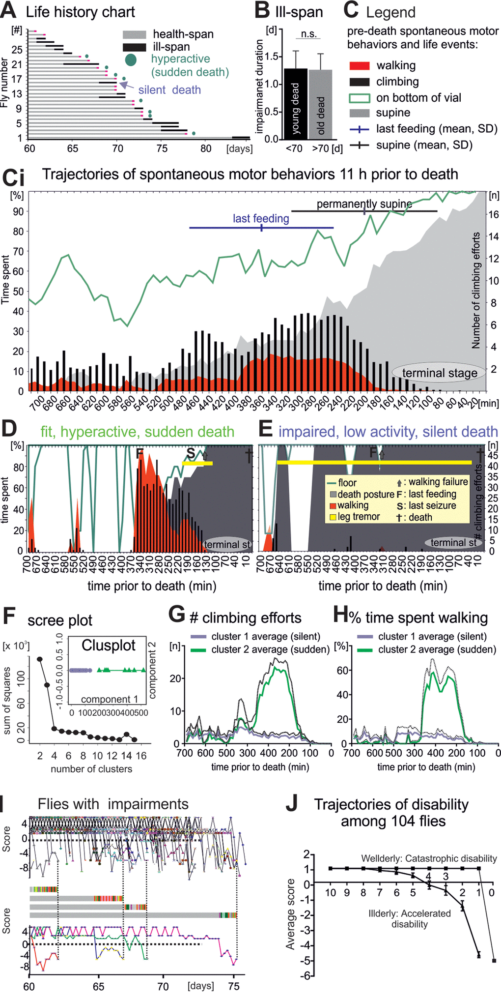 In summary, flies died either silently with progressively accumulating disabilities, or they aged mostly healthy, showed a short period of increased locomotor activity, and then died suddenly. To test for generality, we also analyzed the progression dynamics of ill-span in our longitudinal startle assay study with 104 flies (Figure 1). Plotting the motor performance score of every fly with disabilities over age (Figure 4I) revealed that “fit to impaired” transitions can either be sudden or gradual, as exemplified by score changes of four selected individual flies (Figure 4I, middle and lower panels). Moreover, plotting the average score changes of flies with and without disabilities separately (Figure 4J) revealed two distinct trajectories: First, illderly flies started showing disabilities up to 7 days before death, and disability score worsened exponentially until death (Figure 4J, silent death, accelerating disability). Second, wellderly flies showed no disabilities up to the last day of life, and then showed a steep physical status decline within few hours (sudden death with catastrophic disability). Therefore, at the cohort level, average physical status declines with age, but onset, duration, and severity of age-dependent impairments are variable. The progression of impairment conditions is characterized by both, accumulating disabilities and sudden late-life events.