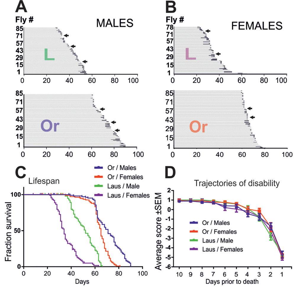 In Drosophila numerous genetic, pharmacological, and dietary manipulations have been reported to prolong lifespan [11] and/or to postpone age-related motor [12] and cognitive decline [13]. In some cases the Drosophila system has allowed to begin pinpointing the underlying molecular and cellular mechanisms [14]. However, the demography of Drosophila late-life pathophysiology, and thus, also the effects of life-prolonging interventions on late-life quality remain largely unknown.