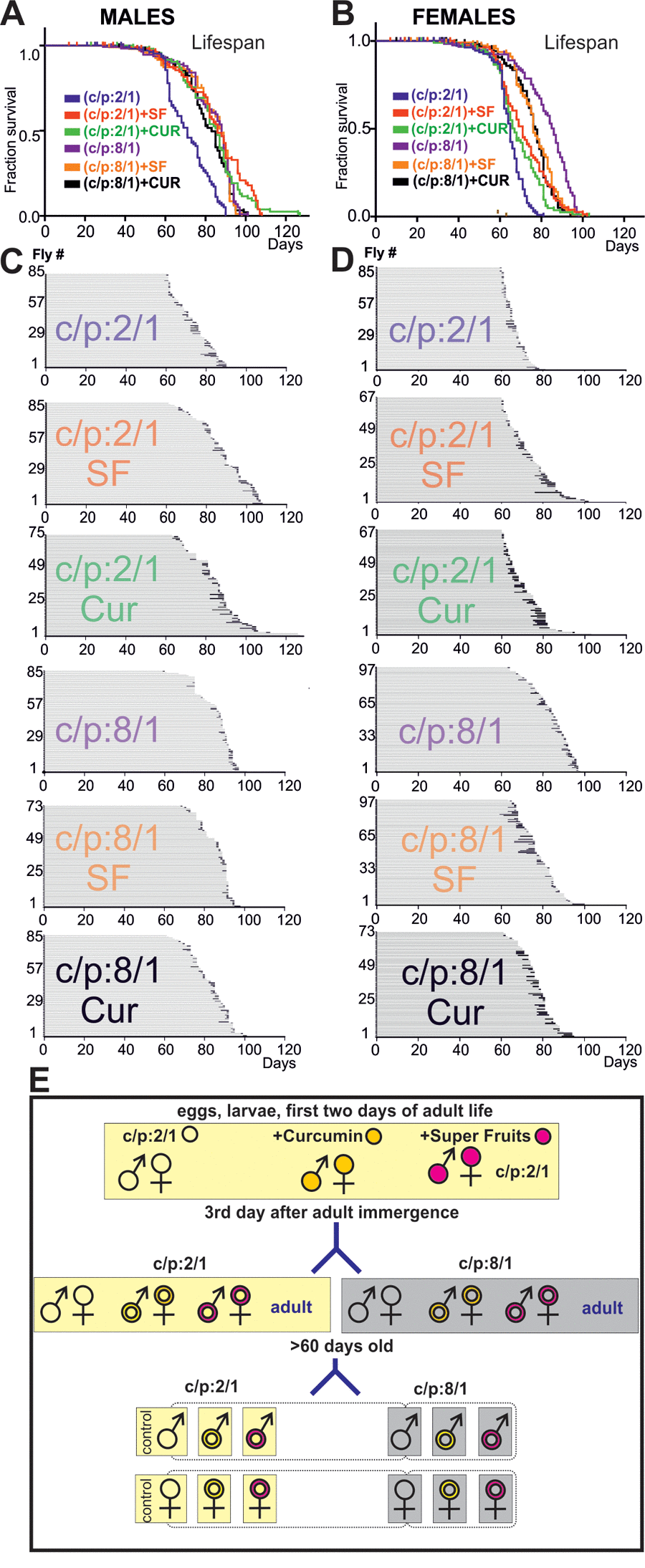 For the dietary run, we followed the protocol outlined in Figure 6E. From an expanded Oregon-R population (20 vials X ~50 flies) freshly emerged flies of both sexes were collected daily for a period of five days and transferred to fresh basic medium (c:p 2:1) alone, or to basic medium (c:p 2:1) supplemented with curcumin, or to basic medium (c:p 2:1) supplemented with Super Fruit (Figure 6E). A day later parents were removed and larvae as well the emerged adults were fed with the one of the three above mentioned diets. Three days old adults were then divided into two groups, the first group was continuously fed on basic media c:p 2:1 diet. The second group was transferred to a basic media c:p 8:1 diet. A the age of 60 days males and females of the first and second group were singled out in vials containing the same basic media (c:p 2:1) and (c:p 8:1) correspondingly (Figure 6E).