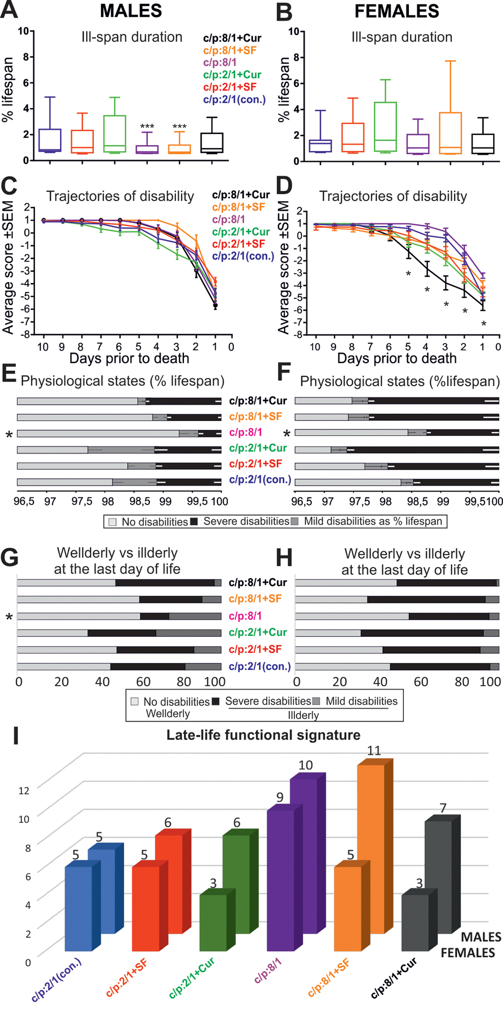 We next asked whether disability severity differed between cohorts. In both genders the duration of mild and/or severe disability as a percentage of lifespan was significantly shorter on high sugar diet (see asterisk C:P 8/1, Figure 7E, F). Therefore, high carbohydrate diet prolonged health-span and compressed morbidity. Note that the supplementation of high sugar diet with antioxidants caused no additional improvement, but by contrast, increased the duration of severe motor disability in male and in female cohorts (Figure 7E, F). Moreover, antioxidants had no ameliorating effect on disability severity in animals fed on low carbohydrate diet, and curcumin even prolonged severe disability duration in females on low carbohydrate diet (Figure 7E, F). Disability duration of females was consistently longer than in males, largely independent of diet, longest with antioxidant supplementation, and shorter on high sugar diet (Figure 7E, F).