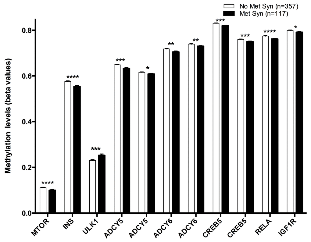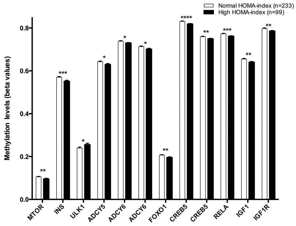 Table 3. Methylation levels of CpG sites located at genes of the longevity-regulating pathways and differences between both age groups.