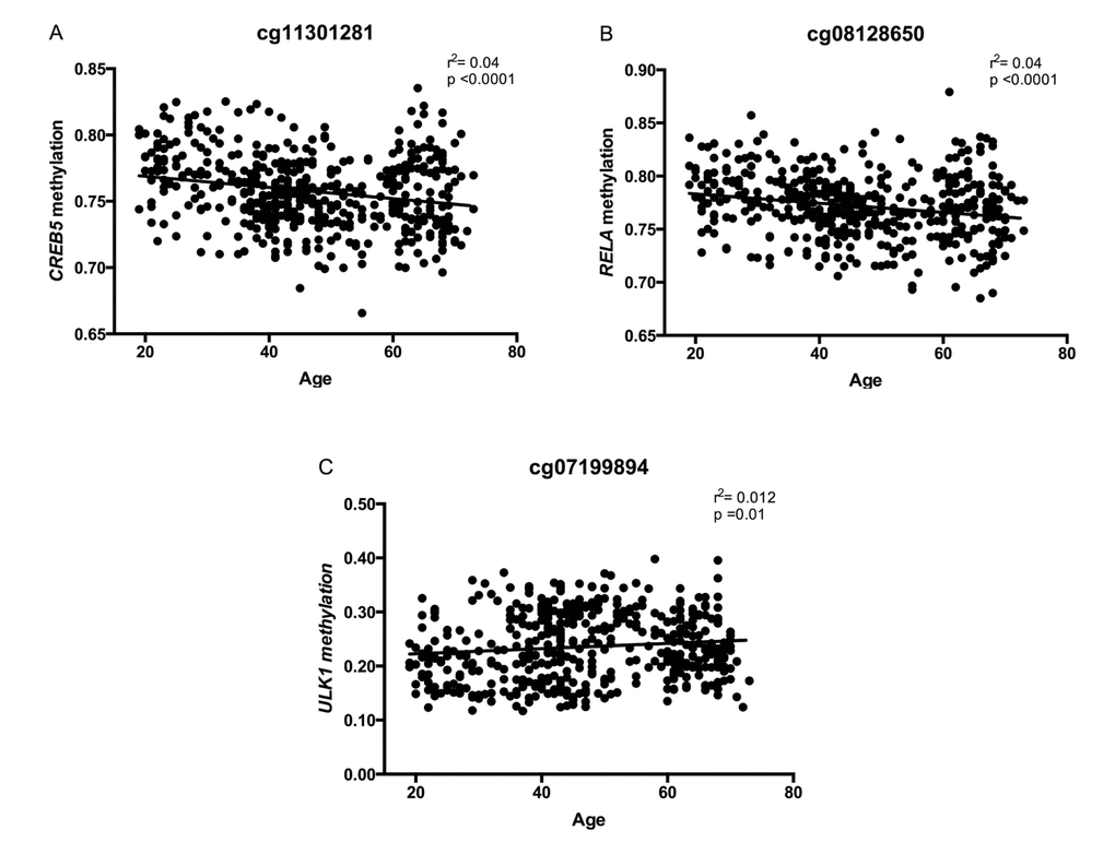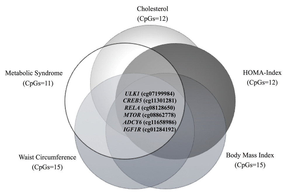 Table 4. Methylation levels of 25 CpG sites located at genes of the longevity-regulating pathways that were differentially methylated between younger (<45 y) and older subjects (≥45 y) in GEO datasets. GSE76399 compared insulin resistant and insulin sensitive individuals in PBMC, whereas GSE65057 compared obese and non-obese individuals in liver samples.