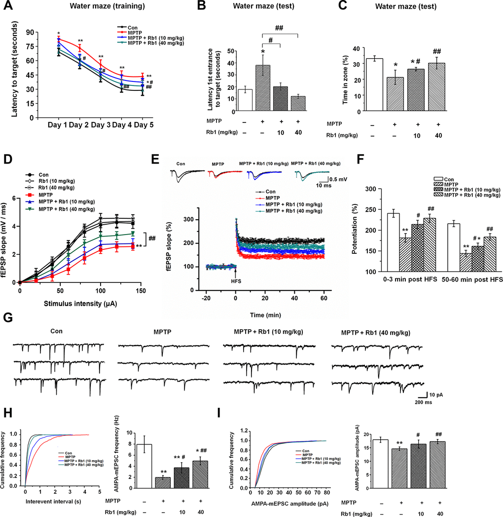 The C57BL/6 mice were divided into four groups: saline control, MPTP group, low dose of Rb1 (10 mg/kg) plus MPTP, and high dose of Rb1 (40 mg/kg) plus MPTP. According to previous studies, the subchronic PD models for studying the memory function were generated by administration of MPTP intraperitoneally for 7 consecutive days at a dose of 30 mg/kg freebase (MPTP-HCl) in saline [39]. The vehicle for MPTP and Rb1 was saline. Rb1 was administered intraperitoneally for 14 consecutive days, starting 3 days before MPTP treatment, at a dose of 10 or 40 mg/kg. The time interval between MPTP and Rb1 injections was greater than 12 h. One day after the last Rb1/saline injection, electrophysiological recording and behavioral tests were performed at the same time.