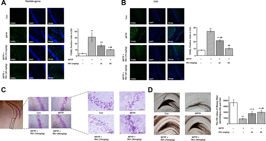 Having demonstrated that Rb1 improves MPTP-induced spatial learning and memory deficits involved in regulating synaptic plasticity and glutamatergic synaptic transmission at the CA3 synapses, we then wanted to know whether Rb1 protects pyramidal neurons from MPTP-induced death in the CA3 and DG. TUNEL staining showed that MPTP induced pyramidal neuron death in the DG and CA3, and both low-dose (10 mg/kg) and high-dose (40 mg/kg) Rb1 treatment prevented the neuronal death (F 3, 36 = 78.777, P < 0.001, post-hoc P = 0.044 for 10 mg/kg Rb1 and post-hoc P < 0.001 for 40 mg/kg Rb1; Figure 2A; F 3, 36 = 74.082, P < 0.001, post-hoc P < 0.001 for 10 mg/kg Rb1 and 40 mg/kg Rb1, respectively; Figure 2B). Moreover, Nissl staining showed that intraneural Nissl bodies were lightly stained and appeared to be sparsely arranged in MPTP-treated mice, and deeper-stained Nissl bodies with higher density in hippocampal neurons were found in the Rb1 treatment group (Figure 2C). Since mossy fiber-CA3 synapses mediate homeostatic plasticity in mature hippocampal neurons [45], MPTP induced dysfunctional CA3 synaptic transmission and neuron loss. We then used Timm staining to examine the effect of Rb1 on the mossy fibers in DG and CA3. Here, the Timm staining showed that mossy fiber intensity was significantly decreased in DG and CA3 in MPTP-treated mice, and Rb1 prevented the reduced mossy fiber intensity (F 3, 36 = 25.690, P < 0.001, post-hoc P = 0.045 for 10 mg/kg Rb1 and post-hoc P = 0.004 for 40 mg/kg Rb1; Figure 2D). These results support the neuroprotective effects of Rb1 in MPTP-mediated hippocampal synaptic plasticity.