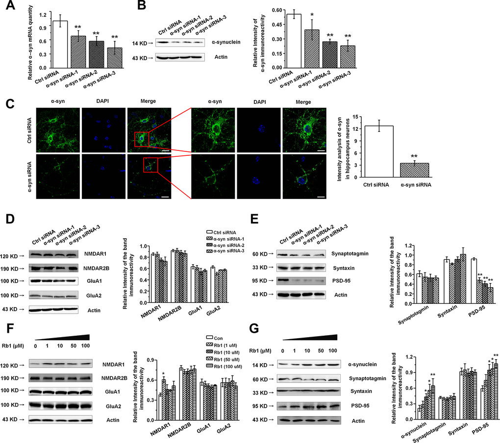 Our findings indicated that Rb1 increased hippocampal glutamatergic transmission as well as α-synuclein and PSD-95 expression, while Rb1 did not affect the glutamate receptors or other synaptic proteins’ expressions in the hippocampus. Additionally, as α- synuclein were also found to be localized at excitatory presynapses and co-expressed with excitatory presynaptic vGluT-1 [31], we wanted to explore whether Rb1’s modulation of synaptic plasticity and excitatory transmission involved upregulation of α-synuclein expression. We cultured primary hippocampal neurons from C57BL/6 mice E16–18 pups and identified the hippocampal neuron with MAP-2 (Supplementary Figure 4). To knock down expression of α-synuclein in the hippocampal neurons, we generated three siRNA sequences targeting α-synuclein. qPCR and Western blotting indicated that the α-synuclein siRNA interference efficiency was nearly 60% (Figure 4A and 4B). The α-synuclein staining in hippocampal neurons after siRNA treatment is shown in Figure 4C, and siRNA reduced the localization of α-synuclein staining in the cytoplasm and dendrite (Student’s t-test, df = 18, P < 0.001; Figure 4C). We further examined the effects of α-synuclein knockdown on the expressions of glutamate receptors and synaptic proteins in the primary hippocampal neurons and found that α-synuclein siRNA did not significantly affect NMDA receptor (NMDAR1, NMDAR2B), AMPA receptor (GluA1, GluA2), or presynaptic protein (synaptotagmin, syntaxin) expression (Figure 4D and 4E). Intriguingly, α-synuclein siRNA significantly decreased postsynaptic PSD-95 expression in the hippocampal neurons (F 3, 8 = 21.297, P < 0.001, post-hoc P = 0.001 for α-synuclein siRNA-1, and post-hoc P < 0.001 for α-synuclein siRNA-2 and 3; Figure 4E), suggesting that α-synuclein may be involved in Rb1’s upregulation of PSD-95 expression in MPTP-treated mice. We then treated the primary hippocampal neurons with different concentrations of Rb1 for 24 h and found that Rb1 significantly increased α-synuclein and PSD-95 expression (α-synuclein: F 4, 27 = 3.860, P = 0.038, post-hoc P = 0.282, 0.028, 0.020 and 0.006 for 1, 10, 50 and 100 μM Rb1, respectively; PSD-95: F 4, 27 = 3.750, P = 0.041, post-hoc P = 0.586, 0.012, 0.026 and 0.008 for 1, 10, 50 and 100 μM Rb1, respectively; Figure 4G), but it did not affect the NMDA receptors (NMDAR2B), AMPA receptors (GluA1, GluA2), or presynaptic proteins (synaptotagmin, syntaxin) (Figure 4F and 4G). These results indicate that α-synuclein decreased PSD-95 expression in hippocampal neurons.