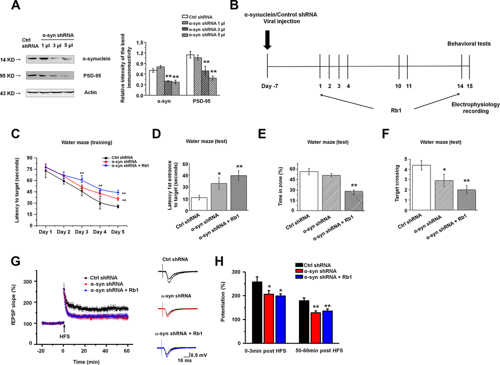 LV-α-synuclein shRNA or control shRNA virus was stereotaxically injected as described previously [58]. Briefly, mice were anesthetized and placed in a stereotaxic frame, and the lentivirus vector in 3.0 µl vol was delivered into both sides of the hippocampal CA3 at the target site (Bregma AP, −3.08 mm; ML, ±2.5 mm; DV, −3.75 mm). A Hamilton syringe was filled with LV-α-synuclein shRNA or control shRNA virus, and the needle was lowered into the tissue at a rate of 0.5 μL/min. The syringe was left in place for 5 min before being slowly withdrawn from the brain. Seven days after virus injection, we intraperitoneally injected Rb1 (40 mg/kg) or saline for another 14 days. One day after the last Rb1 injection, behavioral tests were performed and the mice in each group were sacrificed for the indicated experiments.