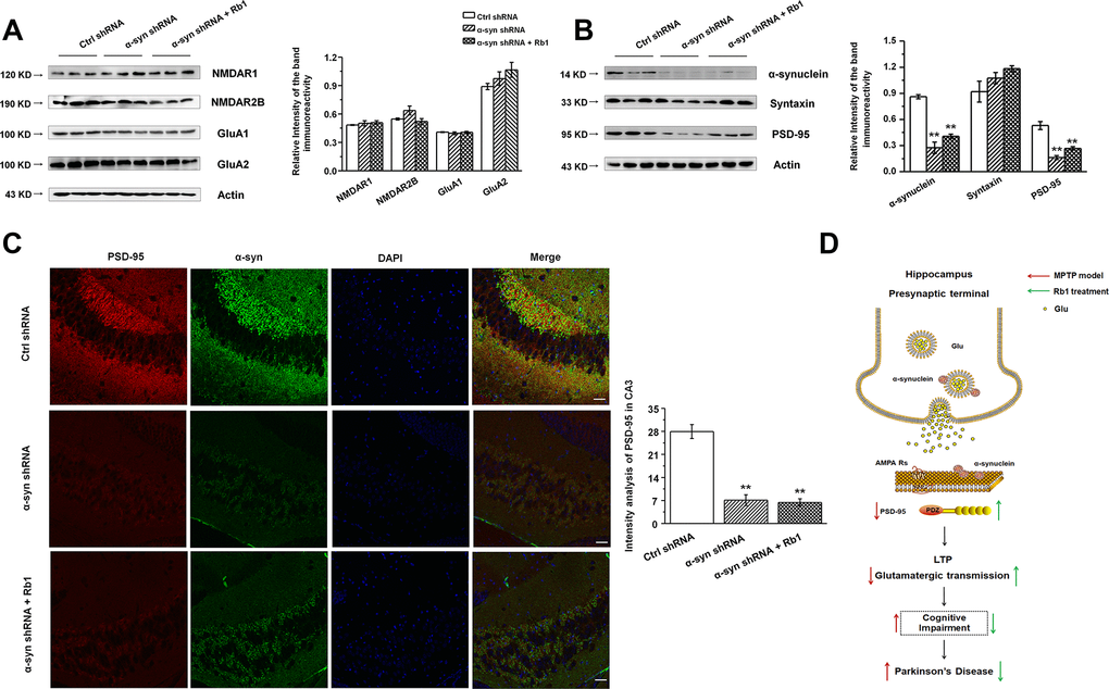Hence, we conclude that Rb1’s regulation of memory function and hippocampal synaptic plasticity may involve the α-synuclein/PSD-95 pathway in the MPTP mice model of PD.
