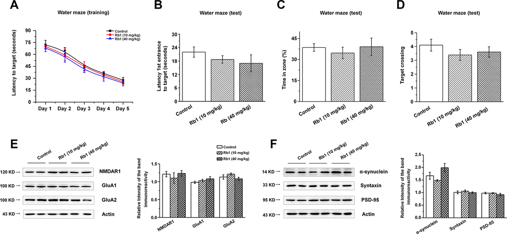 We then examined the expressions of glutamate receptors and synaptic proteins in the hippocampus, and we found that α-synuclein shRNA significantly decreased α-synuclein and PSD-95 expressions, while showing no obvious effects on the NMDA receptors (NMDAR1, NMDAR2B), AMPA receptors (GluA1, GluA2), or presynaptic protein (syntaxin) (Figure 6A and 6B). Furthermore, Rb1 did not prevent α-synuclein or PSD-95 expression in mice injected with synuclein shRNA (α-synuclein: F 2, 24 = 11.334, P = 0.009, post-hoc P = 0.003 for α-synuclein shRNA, and post-hoc P = 0.006 for α-synuclein shRNA+Rb1; PSD-95: F 2, 24 = 29.594, P = 0.001, post-hoc P < 0.001 for α-synuclein shRNA, and post-hoc P = 0.002 for α-synuclein shRNA+Rb1; Figure 6B). Immunofluorescence results also revealed that α-synuclein shRNA significantly decreased PSD-95 expression, while Rb1 did not prevent PSD-95 expression in the hippocampal CA3 region (F 2, 27 = 14.698, P < 0.001, post-hoc P < 0.001 for α-synuclein shRNA and α-synuclein shRNA+Rb1, respectively; Figure 6C). The schematic model for how Rb1 improving cognitive impairment in MPTP mice model was shown in Figure 6D. Furthermore, we found that 10 or 40 mg/kg Rb1 only treated group showed no obvious effects on the spatial learning and memory performance in the Morris water maze test in the normal C57BL/6 mice (Figure 7A–7D). Rb1 treatment in normal mice (10 mg/kg or 40 mg/kg) showed no difference in swim speed in the five-day training phase or in the probe trial test as compared with control (Supplementary Figure 10). We also found that Rb1 showed no obvious effects on the glutamate receptors and synaptic protein expression in the hippocampus in the normal mice (Figure 7E and 7F), suggesting Rb1 may have no obvious effects on the cognitive function of the normal mice.