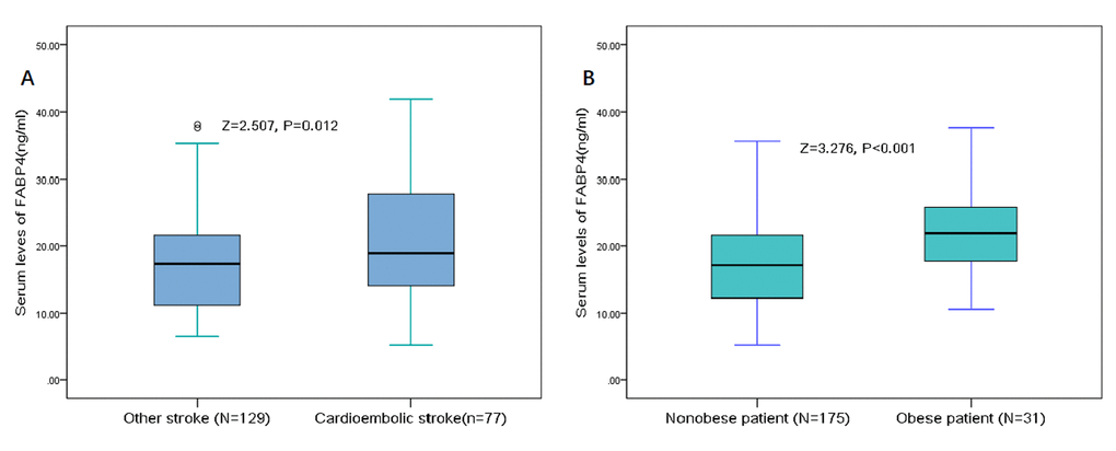 A positive relationship was observed between serum FABP4 levels and stroke severity, since the stroke severity was evaluated with NIHSS score (r=0.493, P<0.001), Table 2. Furthermore, results indicated that FABP4 was correlated with lesion size, suggesting a positive relationship between FABP4 and the infarct volume (r=0.183, P=0.003). A modest correlation was also observed between FABP4 and Hs-CRP (r=0.141, P=0.043). However, no significant correlation was observed between FABP4 and gender, age and HCY (P>0.05 for all), Table 2. The correlation of FABP4 levels with stroke subtypes was also tested. The median FABP4 levels were higher for cardioembolic stroke [n=77] compared to those of other stroke subtypes [N=129] (18.9 [IQR, 14.0-27.8] vs. 17.3 [11.2-21.7] ng/ml; P=0.012; Figure 1A), with significance. In addition, FABP4 levels in obese patient (N=31) was higher than in non-obese (N=175) patients (21.9[IQR, 17.0-25.8] vs. 17.1[12.1-21.6]ng/ml; P<0.001), Figure 1B.