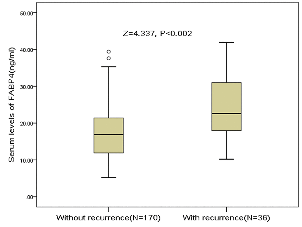 Furthermore, some limitations should be presented. First, the project design of small sample (N=206) and single center cannot produce effective results. In addition, there were only 36 recurrent strokes, leading to a relatively limited power. Thus, the adjustment in logistic regression may be too extensive with overfitting. Second, circulating FABP4 levels were determined with a single measurement at baseline. Without serial testing of FABP4 levels, we yielded no data regarding the change of FABP4 levels in those nondiabetic stroke patients. Interestingly, one study reported significantly elevated FABP4 levels during the early hours after the occurrence of acute myocardial infarction [51]. In addition, cerebrospinal fluid samples were not obtained. Third, there were no data for other adipokine, such as leptin, omentin and retinol binding protein 4 (RBP4). The association between FABP4 and those factors should be clarified. Hence, the true association between FABP4 and stroke recurrence might be caused by those adipokines confounds. Fourth, some diabetes markers, such as Homeostatic Model Assessment of Insulin Resistance (HOMA-IR) and Hemoglobin A1c (HbA1c) might affect the predictive effectiveness of FABP4 in the non-diabetic patients. However, in this study, we did not test those factors due to the diabetic patients had been excluded. Thus, the impact of those factors on stroke recurrence in relation to the serum FABP4 remains unclear. Interestingly, Tu et al. [24] reported that serum FABP4 was a positive risk factor for stroke outcome independent from HOMA-IR and HbA1c. Lastly, any causal relationship could not be suggested due to the cross-sectional study design. What’s more, the patients with the secondary endpoint of all-cause death were not included in the analysis, who may also experience stroke recurrence. Therefore, the results can be under-estimated. The association between FABP4 and mortality was not evaluated, since the mortality data was not collected in current study.