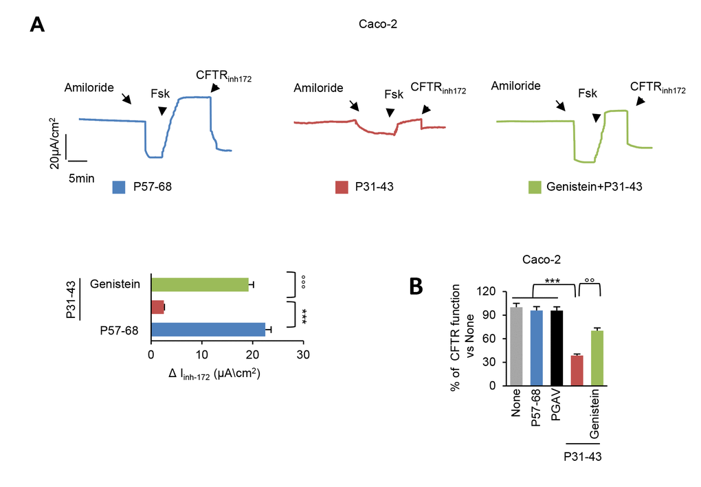 Genistein is a biologically active isoflavone found in soy products [23]. As many naturally-derived compounds with beneficial effects on human health, genistein is endowed with multifaceted biological functions [25–28]. Beyond its ability to potentiate CFTR channel gating [25–28], genistein reportedly has a broad activity on a variety of diseases including cancer, insulin resistance, diabetes, obesity, chronic inflammation [32,33]. Characterizing the mechanisms through which over-the-counter nutraceuticals such as genistein may have a broad pro-health activity is crucial for defining appropriate indications and for designing discovery programs aimed at selecting more active compounds. Here, we demonstrate that genistein protects intestinal epithelial cells from the pro-inflammatory effects of P31-43 through an on-target effect, namely by stimulating CFTR function. Indeed, the protective effects of genistein against P31-43 induced epithelial stress were lost if CFTR was genetically removed from the system. It will be interesting to learn whether other natural compounds may have similar CFTR-stimulatory effects.