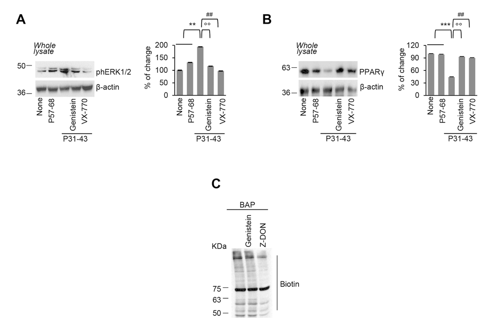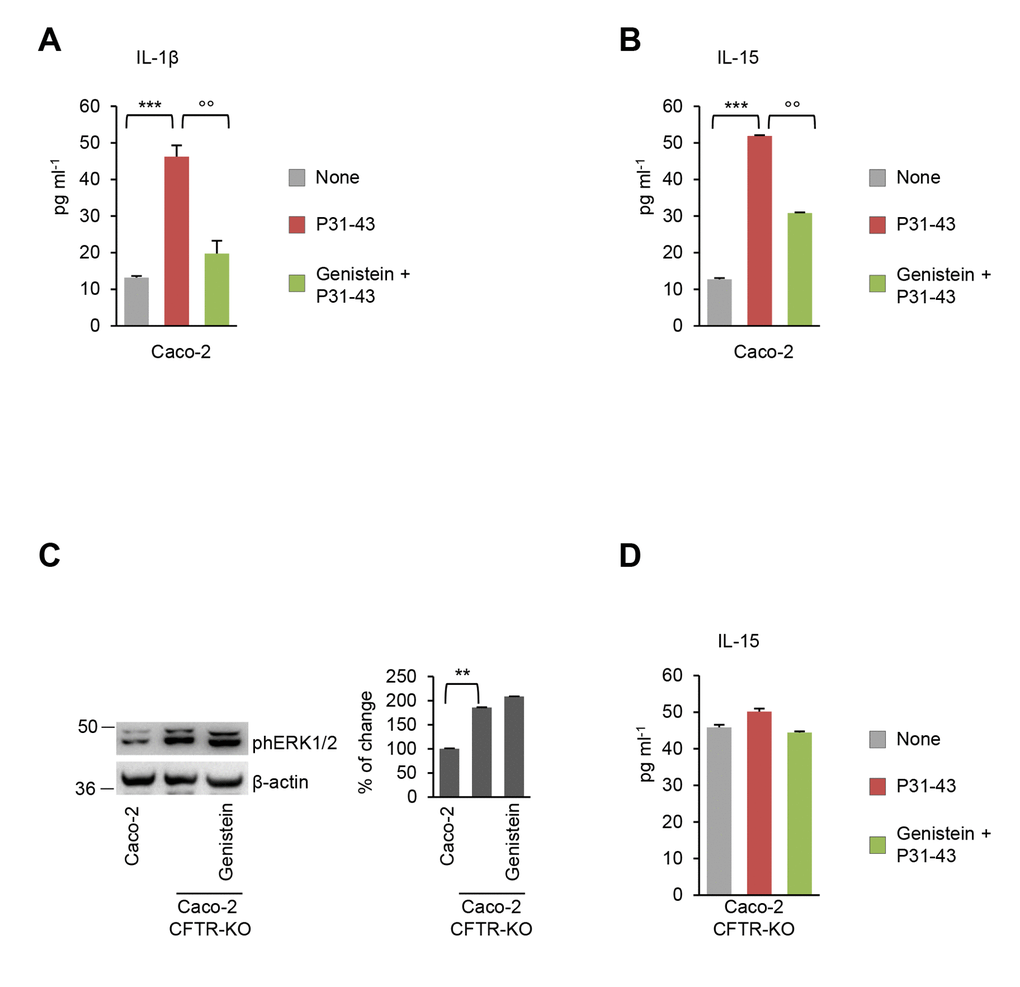 As it is true for most natural compounds, genistein is endowed with pleiotropic activities, including antioxidant and anti-inflammatory properties [32,33]. To determine whether the capacity of genistein to oppose P31-43 effects on epithelial cells is secondary to the potentiation of CFTR channel function, we used Caco-2 cells in which stable CFTR deletion was induced by CRISP/Cas9 technology (Caco-2CFTR-KO). In the absence of CFTR expression, genistein was unable to oppose the capacity of P31-43 to induce ERK1/2 phosphorylation (Figure 4C) and IL-15 upregulation (Figure 4D), thus confirming that genistein, similarly to VX-770 [12], controls the epithelial stress response and IL-15 production through on-target (via CFTR) rather than off-target effects.