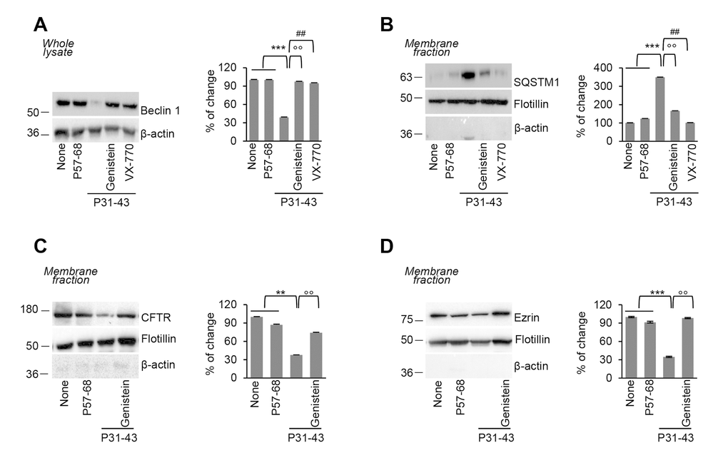 We previously demonstrated that the pharmacological [13] or P31-43 mediated [12] inhibition of CFTR function leads to CFTR disposal from the plasma membrane (PM) of epithelial cells owing to CHIP-mediated CFTR ubiquitination and subsequent SQSTM1 binding that diverts CFTR recycling to lysosomal degradation. In line with the protective effect of genistein against the P31-43 induced CFTR inhibition and accumulation of SQSTM1, pretreatment with genistein prevented the P31-43 induced disposal of mature CFTR from the plasma membrane (Figure 3C). Moreover, genistein negated the capacity of P31-43 to favour PM disposal of the CFTR interactor ezrin (Figure 3D), a key component of the ezrin–radixin–moesin (ERM) membrane complex that contributes to cytoskeleton organization and F-actin assembly.
