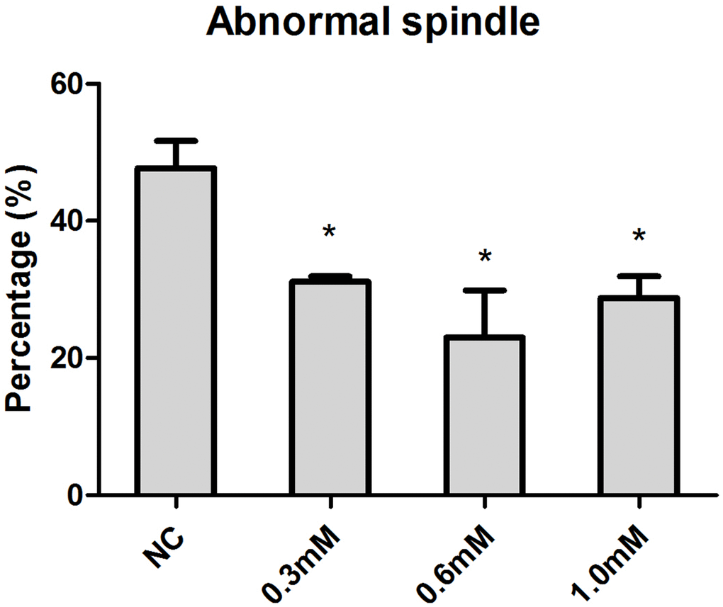 Increasing concentrations (0.3mM, 0.6mM, 1.0mM) of NAC were supplied to culture medium (M2) for in vitro oocyte culture to test whether NAC treatment could delay aging-induced changes in spindle anomalies. Oocytes aged in vitro were collected after 24h of culture for immunofluorescence analysis. The results showed that fresh oocytes displayed bipolar spindles with focused poles. Various formations of severely abnormal spindles were found in aged oocytes, including elongated spindles and spindles with abnormal poles, with the major spindle defect being spindles with no apparent poles. We found significant differences in oocytes treated with 0.3mM, 0.6mM, and 1.0 mM NAC displaying a lower rate of abnormal spindles compared to oocytes without NAC treatment (Figure 1), suggesting that NAC delayed post-ovulatory oocyte aging in vitro. Due to fewer numbers of spindle anomalies caused by 0.6mM NAC, we used this concentration for all subsequent experiments.
