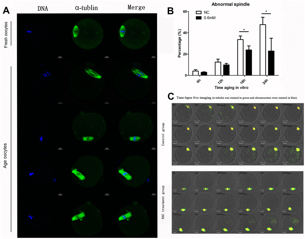 Next, live cell imaging was performed to analyze the dynamic changes of spindles after treatment with or without NAC. In control aging oocytes, spindles gradually lose poles. At around 14h and 40 minutes of live cell imaging, spindles without one pole were observed. At 20h and 40 minutes, both poles disappeared. In contrast, normal morphological spindles were observed at 14h and 40 minutes when oocytes were treated with NAC. At 20h and 40 minutes of live cell imaging, the two poles could still be seen in the spindles (Figure 2C). The results showed that NAC treatment could delay the changes in spindle anomalies during post-ovulatory oocyte aging in vitro.