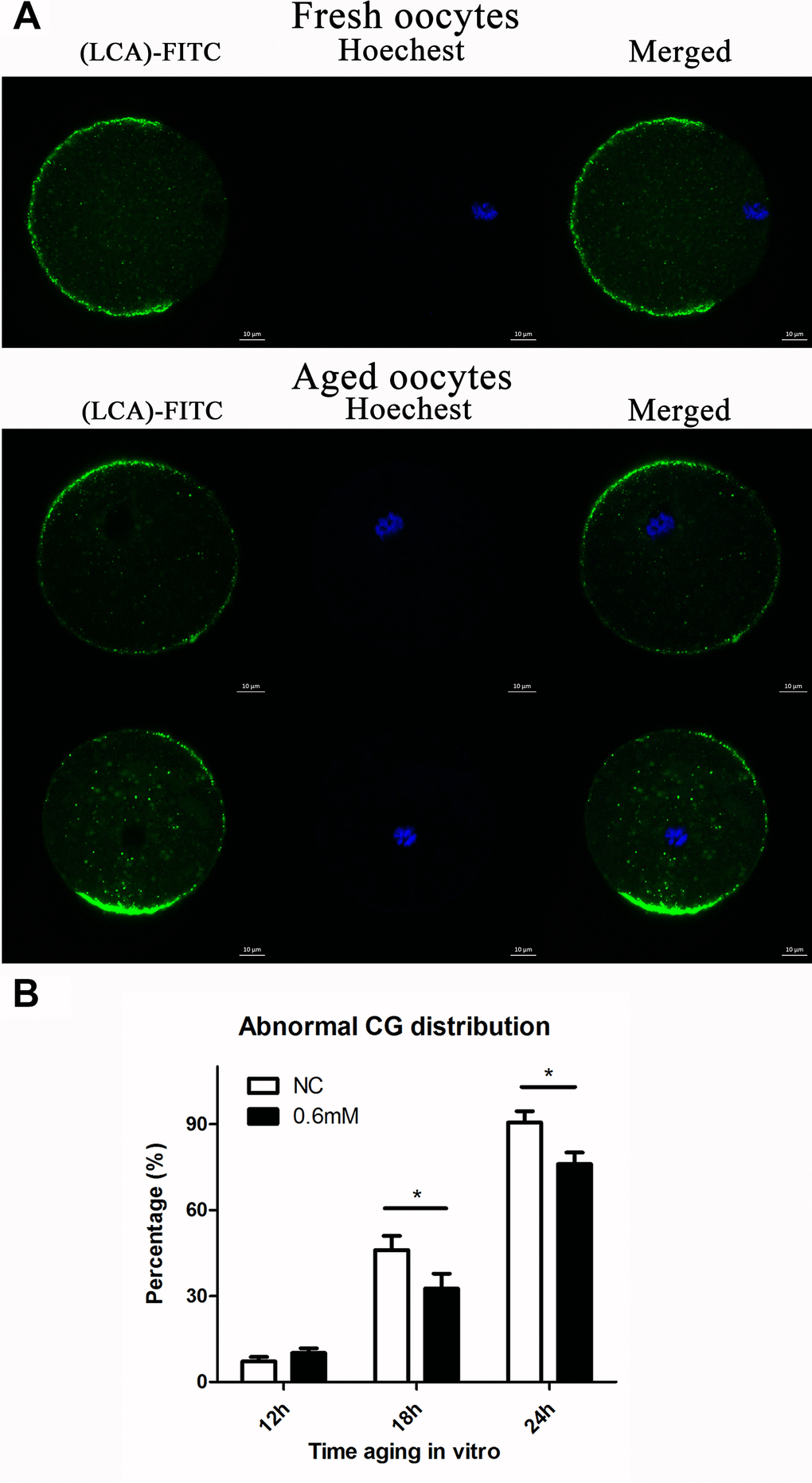 It has previously been shown that post-ovulatory oocyte aging causes morphological changes in the spindle, as well as abnormal distribution in CGs. We investigated the distribution of CGs during post-ovulatory oocyte aging in vitro with or without NAC treatment. Confocal microscopy showed that different distribution patterns of CGs appeared during post-ovulatory oocyte aging in vitro. We determined that oocytes displayed a layer of CGs beneath the oolemma and a distinct CG-free domain near the area of the spindle apparatus that we called normal distribution in fresh oocytes. On the other hand, during post-ovulatory oocyte aging, CG congregation occurred. We found two major types of abnormal distribution: type I, all CGs moved to the cortex of oocytes without leaving CG-free domains; Type II, CGs moved to CG-free domains near the chromosomes (Figure 3A), and the percentage of abnormal distribution of CGs clearly increased obviously at 18h and 24h of in vitro culture in contrast to fresh oocytes. However, compared with control oocytes, the oocytes treated with 0.6mM NAC showed a lower percentage of abnormal CG distribution at 18h and 24h (Figure 3B), indicating its protective effect on post-ovulatory oocyte aging in vitro. However, no significant difference was observed between the NAC supplementation group and the control group at 12h of culture in vitro.