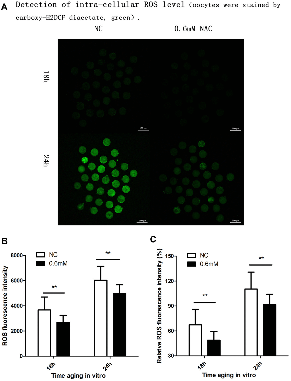 Cellular increase in reactive oxygen species (ROS) level is further considered to be an important change in post-ovulatory oocyte aging. So we further investigated whether NAC treatment could protect oocyte quality by decreasing the intra-cellular ROS level. Because we found protective effects of NAC supplementation on spindle integrity and CG distribution at 18h and 24h during post-ovulatory oocyte aging in vitro, the ROS level was analyzed at 18h and 24h of culture. Oocytes collected and analyzed at 24h of post-ovulatory aging showed increased ROS levels when compared to oocytes aged for 18h. When MII oocytes were exposed to 0.6mM NAC, the ROS level observed at 18h or 24h was significantly lower compared to oocytes in the control group (Figure 4), indicating reduced ROS by NAC supplementation.