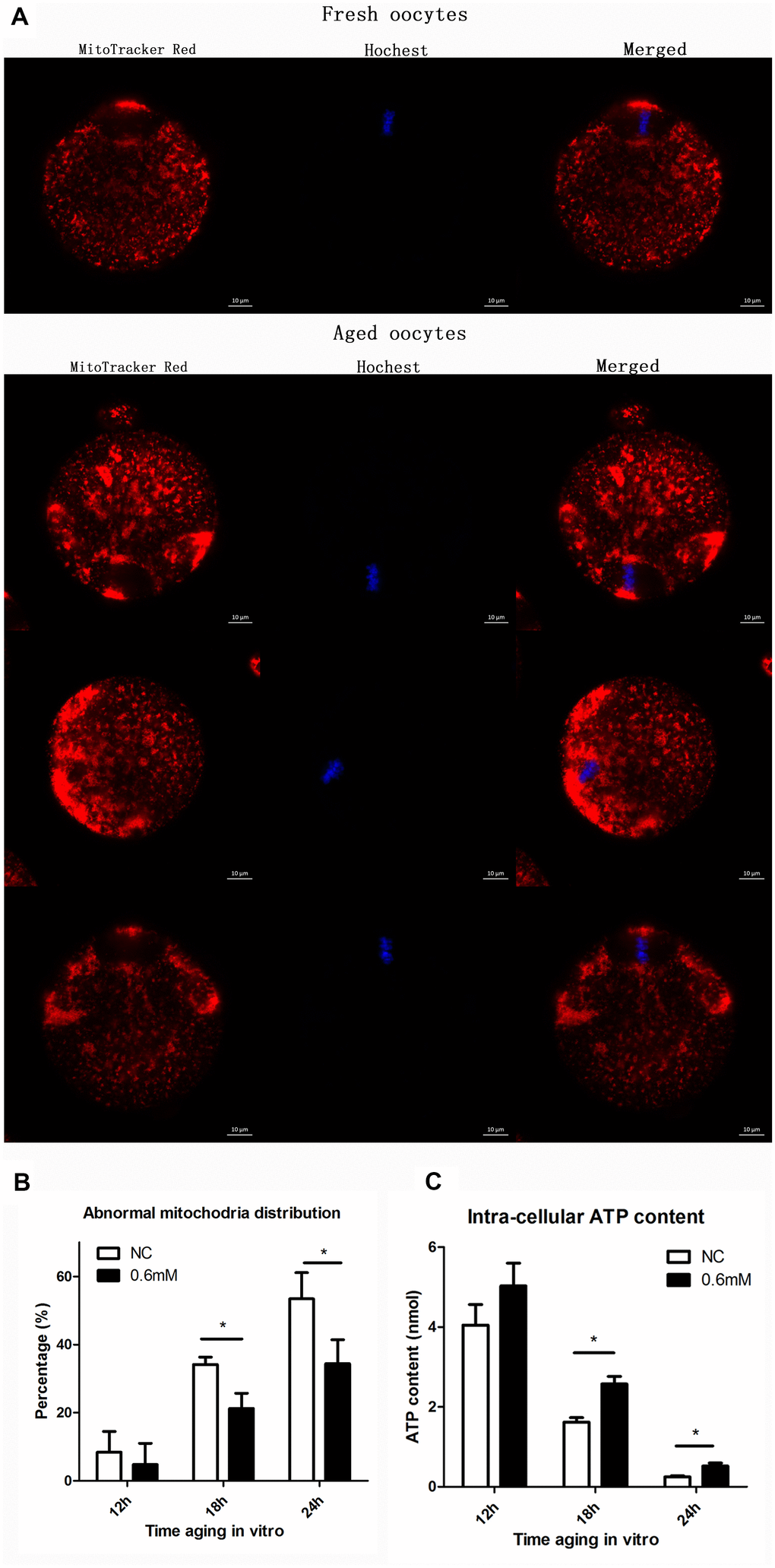 We next examined whether the function of mitochondria could be maintained effectively with NAC supplementation. Two experiments were designed to test the function of mitochondria. The first experiment was to show the distribution of mitochondria by fluorescence staining, and the second was to analyze the cellular ATP level. Confocal microscopy showed different distribution patterns of mitochondria in oocytes aging in vitro (Figure 5A). Mitochondria of fresh oocytes displayed even distribution, referred to as normal distribution while aged oocytes showed asymmetric clustered distribution. At 18h or 24h of post-ovulatory oocyte aging, the proportion of the abnormal distribution pattern was significantly decreased in the NAC-treated group when compared to the control group (Figure 5B). Oocytes were collected at 12h, 18h and 24h of aging for ATP content analysis. No significant difference was found between control groups and treatment groups at 12h. However, the ATP level at 18h and 24h was clearly higher in NAC-treated oocytes than in oocytes without NAC treatment (Figure 5C). These results suggest that treatment with NAC during post-ovulatory oocyte aging can help to maintain normal mitochondrial functions.