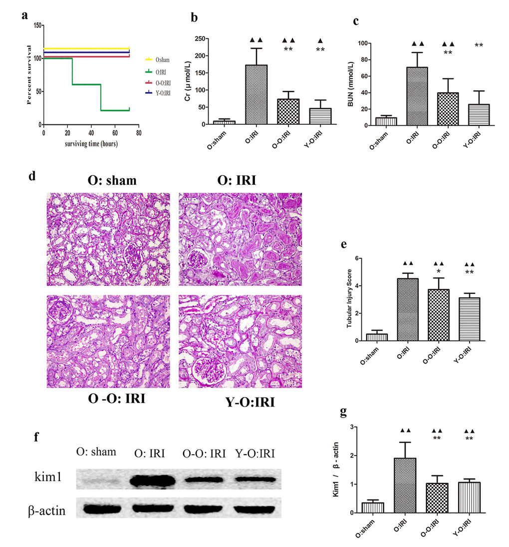 At 72 hours following the procedure, 21.4% of the old IRI mice survived. Conversely, 100% of the old-old parabiotic or the young-old parabiotic IRI mice survived for this time period. At 72 hours following IRI, the old IRI mice showed extensive loss of tubular brush borders, epithelial necrosis and degeneration of the basement membrane, cast formation, and tubular dilatation, accompanied by an increase in the acute tubular injury score. The expression of Kim1, a marker of renal tubular injury, was also elevated, as was serum Cr and BUN. Compared to the old: IRI group, the old parabiotic IRI mice of the O-O: IRI group and the Y-O: IRI group had significantly lower acute tubular injury scores, significantly lower Kim1 expression, and a significantly smaller increase in serum Cr and BUN. There was no significant difference between the aged IRI mice of the old-old parabiotic group and the aged IRI mice of the young-old parabiotic group, with regard to acute tubular injury scores, serum Cr, BUN, and mortality. These findings suggest that, at 72 hours following IRI, the exogenous biological renal support introduced by parabiosis from either an old-old or a young-old pairing could significantly alleviate renal histological injury and improve serum Cr, BUN, and mortality in old IRI mice (Figure 1).