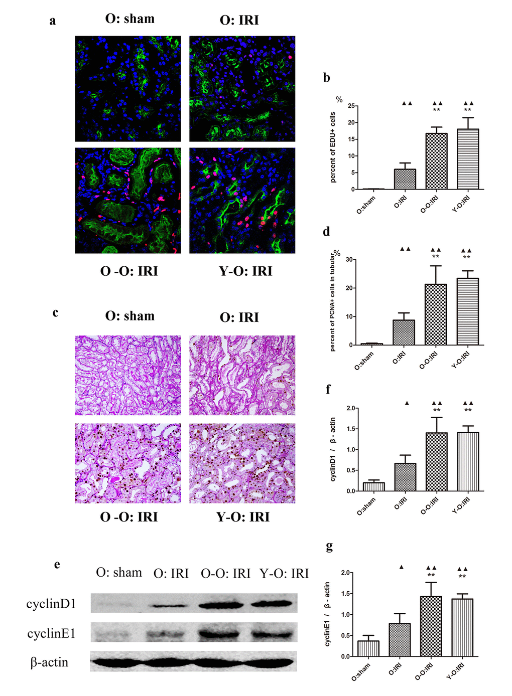 At 72 hours following IRI, the percentage of 5-Ethynyl-2-deoxyuridine (EDU)-positive and proliferating cell nuclear antigen (PCNA)-positive cells was higher in the old: IRI group than in the old: sham group. EDU-positive cells were mostly located outside the tubular brush borders, as marked by lotus tetragonolobus lectin (LTL), while PCNA-positive cells were mostly located within the tubular base membranes, as marked by periodic acid–Schiff (PAS) staining. Furthermore, the expression of cyclin D1 and cyclin E1 was also significantly higher in the old: IRI mice than in the old: sham group. In addition, the percentage of EdU-positive cells and PCNA-positive renal tubular cells in the O-O: IRI and the Y-O: IRI group were significantly higher than in the old: IRI group, accompanied by higher cyclin D1 and cyclin E1 expressions. Conversely, there was no significant difference regarding aged IRI mice between the old-old parabiotic group and the young-old parabiotic group. These findings indicate that the exogenous biological renal support provided by parabiosis can significantly improve tubular cell proliferation in old IRI mice kidney (Figure 2).