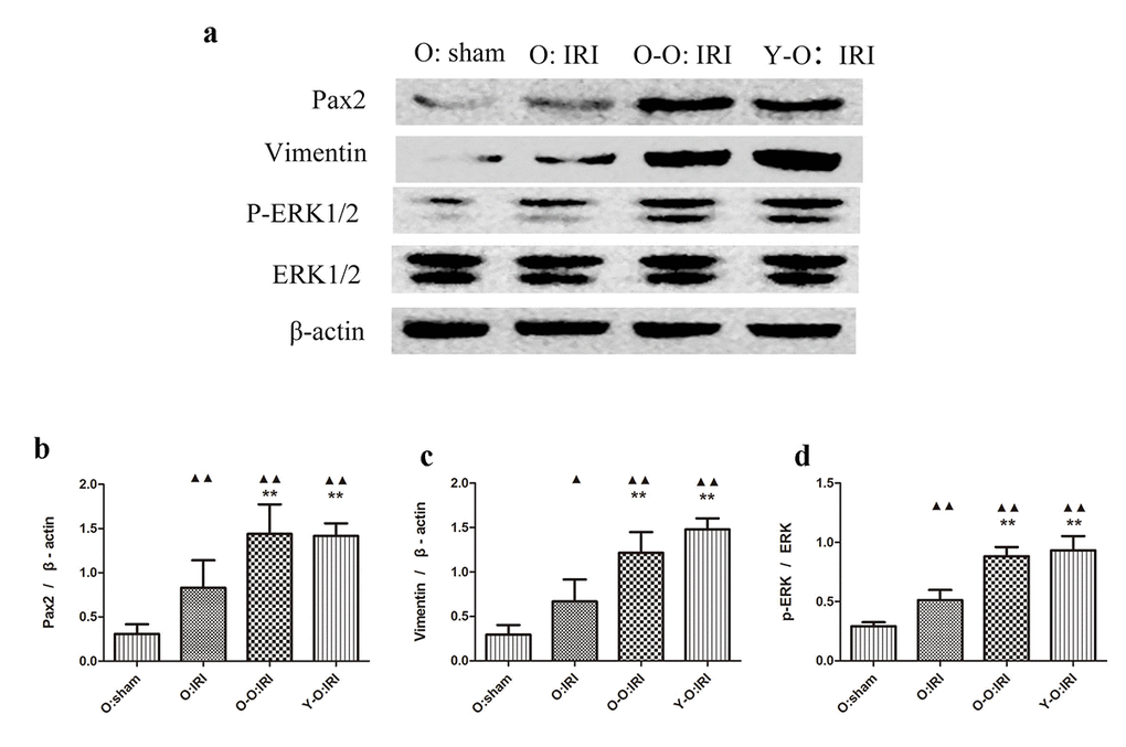 Dedifferentiated tubular cells are primarily responsible for repair after renal IRI, and ERK1/2 may promote tubular dedifferentiation and proliferation, which we examined using vimentin, Pax2, and ERK1/2 [18]. We found that the expressions of vimentin, Pax2 and ERK1/2 was significantly higher in the old: IRI groups 72 hours after IRI, than in the old: sham group. The expression of vimentin, Pax2, and ERK1/2 was significantly higher in the O-O: IRI group and the Y-O: IRI group than the old: IRI group. There was no significant difference regarding these proteins between the O-O: IRI group and the Y-O: IRI group. These findings indicate that the exogenous biological renal support provided by parabiosis may promote renal dedifferentiation in old IRI mice (Figure 3).