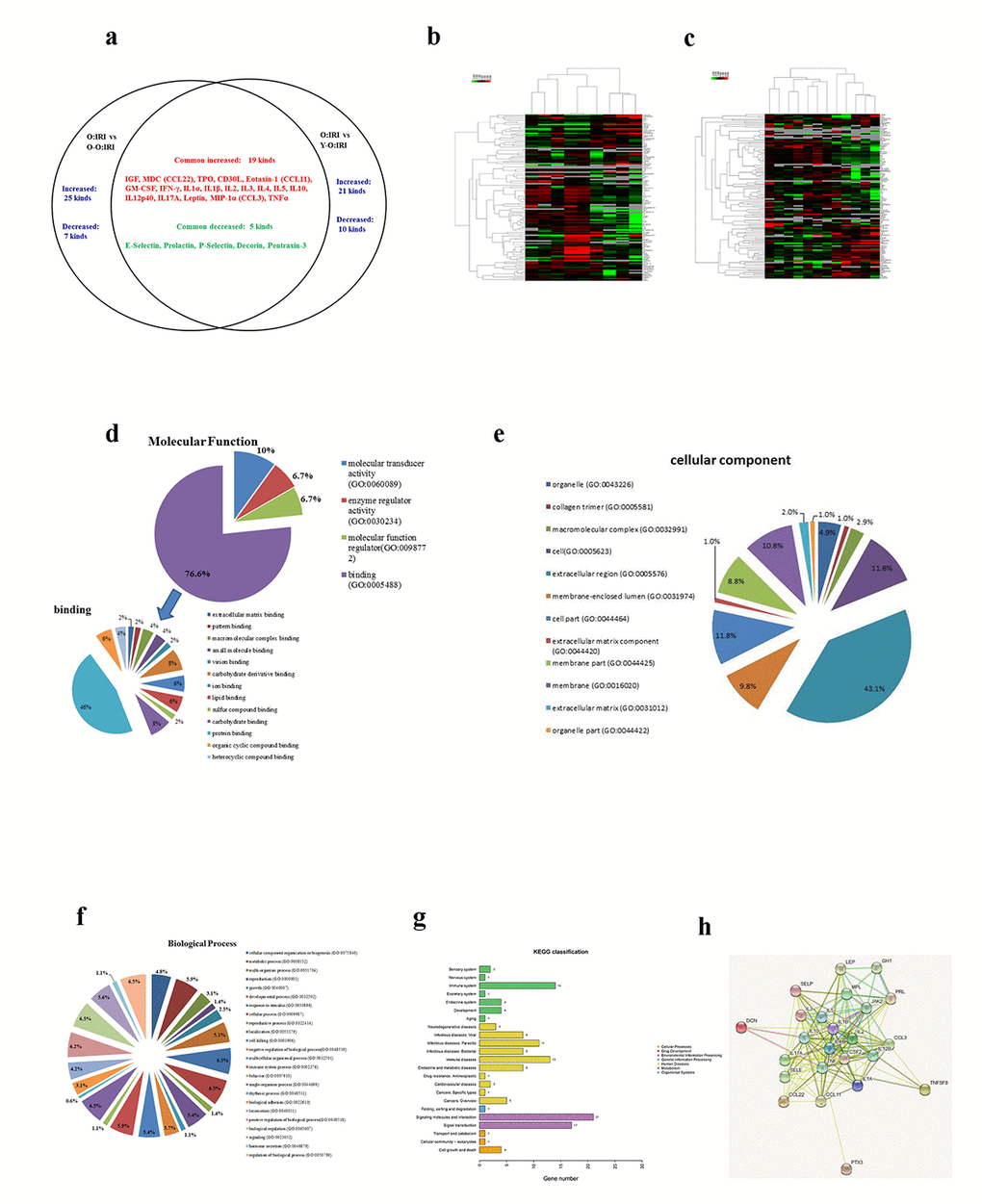 It is still unclear which harmful cytokines were removed by the exogenous biological renal support and/or which protective cytokines were supplied. However, the differences in the levels of cytokines did improve the survival of the old IRI mice. To address this issue, we used a cytokine array to screen for differentially expressed cytokines in the mice serum. The results were as follow: (1) the cytokines that were differentially expressed cytokines between the Y-O:IRI and O:IRI groups were similar to those that differed between the O-O:IRI and O:IRI groups. This suggests that there is no significant difference in the effect posed by the circulating internal environment between the younger mice and the older mice. (2) the common differentially expressed cytokines between the Y-O:IRI and O:IRI groups and between the O-O:IRI and O:IRI groups were identified. Most of these differentially expressed proteins are involved in biological pathways related to inflammation mediated by chemokines and cytokine signaling pathways, and the interleukin signaling pathway using PANTHER analysis. Using KEGG pathway analysis, the proteins related to signaling molecules and interactions, and signal transduction were identified. Furthermore, the majority of these cytokines belonged to the protein-protein interaction network. This indicates that an interaction occurs between these cytokines. These results suggest that exogenous biological renal support may up-regulate inflammatory related factors, which play an important role in the amelioration of renal IRI and the lowering of the mortality.