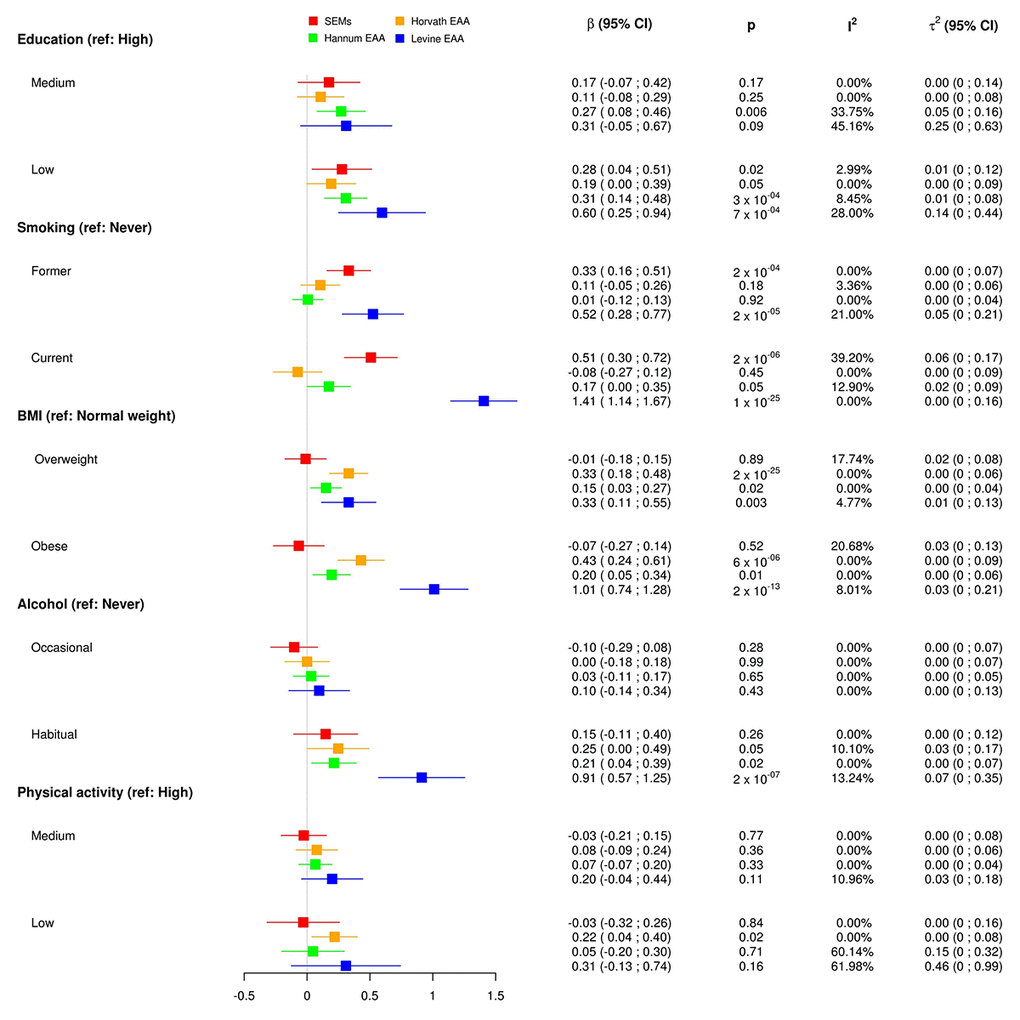 Education was the only SEP indicator used in this study. Critical alternative SEP indicators like income or occupational position were not available in all of the cohorts used in this meta-analysis. We chose to consider all the variables as categorical, with three levels each. On the one hand, this procedure helped us to compare the effects of low education with that of other risk factors, but on the other hand, could lead to a reduction in statistical power to detect significant associations. The lack of association of epigenetic aging measures with low physical activity is not in line with previous literature [27] which might be explained by heterogeneity in the variable definition across cohorts.