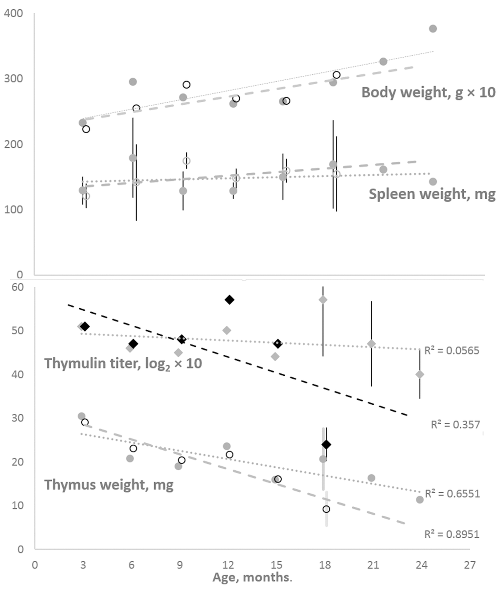 To determine changes in thymus and spleen weights and serum thymulin titers and in whole body weight, the cohorts of female WT FBN/N mice (N0=77) and K14/mIGF1 mice (N0=57) were established at Institute of Genetic and Regenerative Medicine. Ten mice of each cohort were sacrificed by decapitation at the age of 3 months and in every 3 months thereafter. Thymuses and spleens were dissected and weighed. Serum samples obtained by centrifugation of clotted blood were stored at –20°C. Thawed samples were filtered through Centriflo CF-25A ultrafilter (Amicon, USA) to remove the high molecular inhibitor of thymulin. Thymulin titers were determined as described in [41]. The determination method is based on the ability of thymulin to restore the sensitivity of spontaneous rosette formation by splenocytes from thymectomized mice to inhibition with azathioprine (Sigma, USA). The results were recorded as log2(thymulin titer).