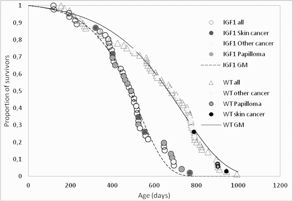 Notably, in lnμ0 vs. γ plots, the vector related to K14/mIGF1 vs. wild type FVB/N mice is parallel to the γ axis, which is strikingly different from all other vectors in Figs. 5. This difference is remarkable per se irrespective of its possible interpretations. Calorie restriction is the only other interference in lifespan, among several other interferences whose results have been treated in the same way [20] as here, to be consistently manifested as long horizontal vectors in lnμ0 vs. γ plots. Calorie restriction is generally believed to slow down aging rather that to decrease the initial mortality. This strengthens the conclusion that increased aging rate is what makes the lifespan of K14/mIGF1 mice to decrease.