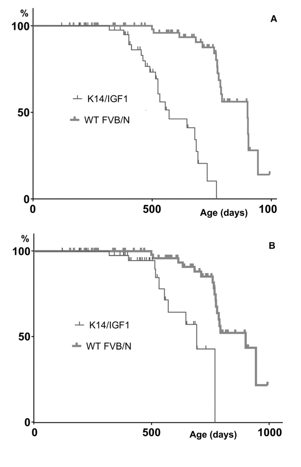 The available evidence is insufficient to combine properly the known pieces of the puzzle that thus has emerged. Here we provide additional pieces by reporting on changes in lifespan and tumor incidence that accompany IGF1 expression driven by keratin-14 promoter in FVB/N-derived transgenic K14/mIGF1 female mice. The local beneficial effects of IGF1 overexpression in the skin of these mice are manifested as enhanced wound healing [14]. Increased IGF1 expression in the skin of K14/mIGF1 mice was reported, but no changes in serum IGF1 levels, as well in heart and liver weights, were found in K14/mIGF1 vs. FVB/N mice [14]. This suggests that the effects of IGF1 in K14/mIGF1 mice are not systemic but rather are confined to the sites of IGF1 overexpression. These sites are not limited to the skin in K14/mIGF1 mice, since keratin-14, whose gene promoter is used to drive IGF1 expression in this case, is expressed also in the reproductive system and the upper gastrointestinal tract (https://www.proteinatlas.org/ENSG00000186847-KRT14/tissue) and in the thymus [15].