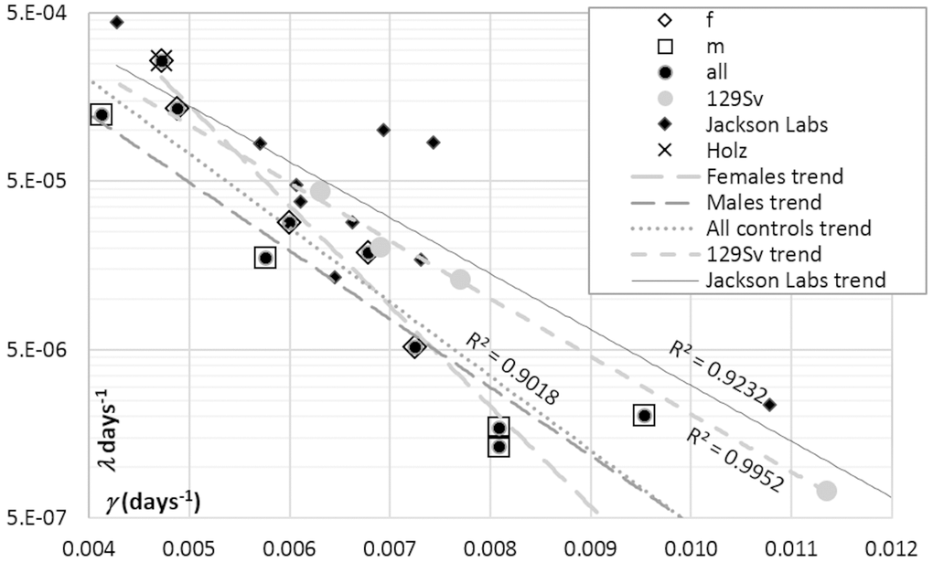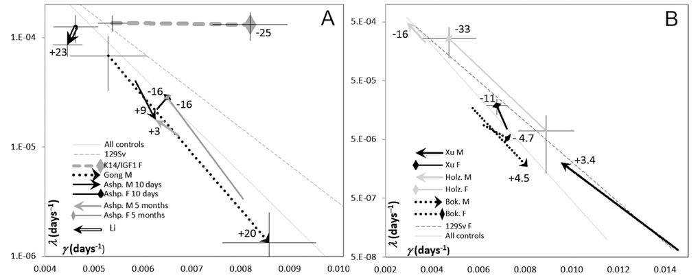 To distinguish between real and apparent changes in GM parameters, we employed the approach suggested and thoroughly discussed in [20], where it was used to differentiate the effects of calorie restriction and of drugs believed to mimic it. In essence, when a change in μ0 is associated with a reciprocal change in γ, the latter is valid only if it is different from what the artifactual regression of lnμ0 on γ would suggest. Ideally, for each particular population of a specific murine strain and gender, this regression must be derived from a series of control samples (as it is in the case of 129/Sv mice in Figure 4) or the randomization of a sufficiently large control sample into several subsamples. However, because all regression lines in Figure 4 are almost parallel, their general trend may be used as a reference.