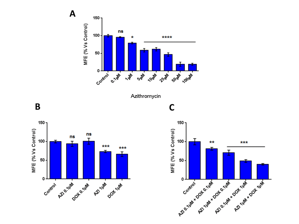 Figure 1 shows that at low concentrations (0.1 μM and 1 μM) Doxycycline and Azithromycin alone had little or no effect on the inhibition of mammosphere formation. However, the combination of 1 μM Doxycycline and 1 μM Azithromycin exerted a very significant inhibitory effect on mammosphere formation.
