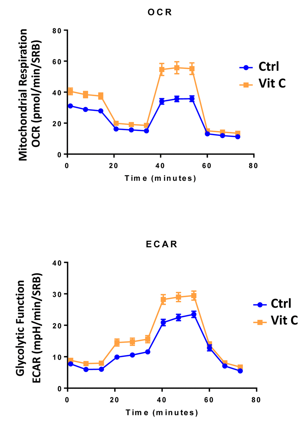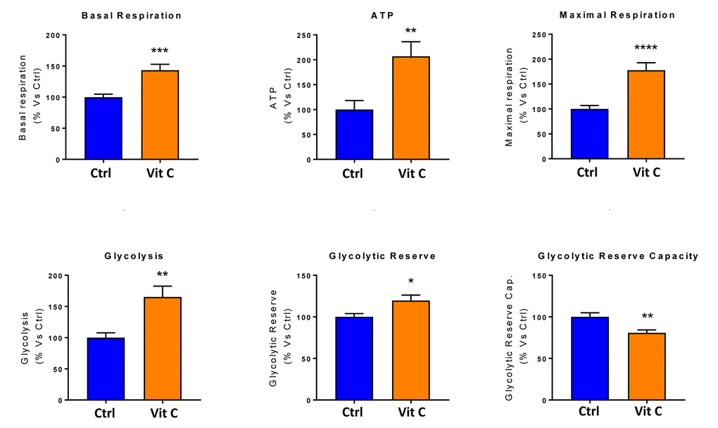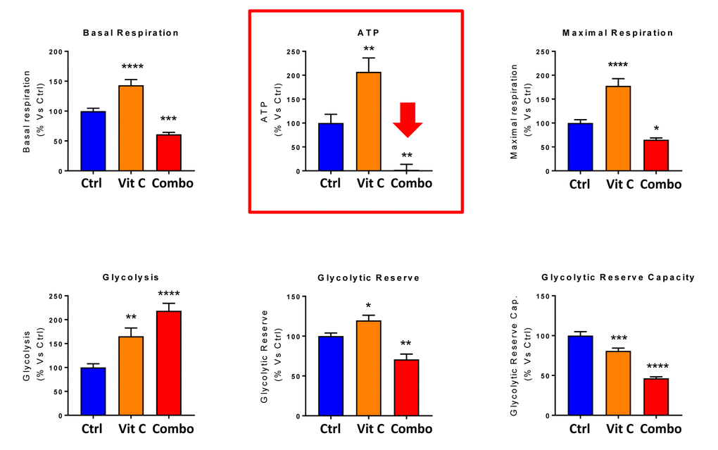 Previous studies have shown that Vitamin C by itself increases mitochondrial ATP production by up to 1.5-fold, in the rat heart, under conditions of hypoxia [16]. In addition, Vitamin C is a positive regulator of endogenous L-carnitine biosynthesis, an essential micro-nutrient that is required for mitochondrial beta-oxidation [17,18]. As such, these findings are consistent with our current results showing that Vitamin C alone is indeed sufficient to increase mitochondrial ATP production, by up to 2-fold, in MCF7 cells (Figure 16).