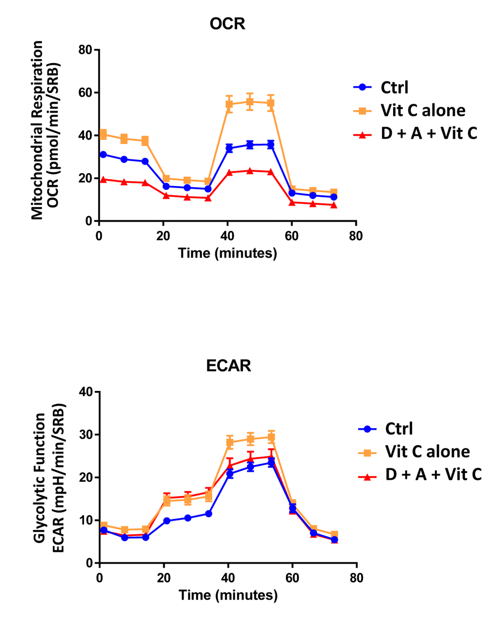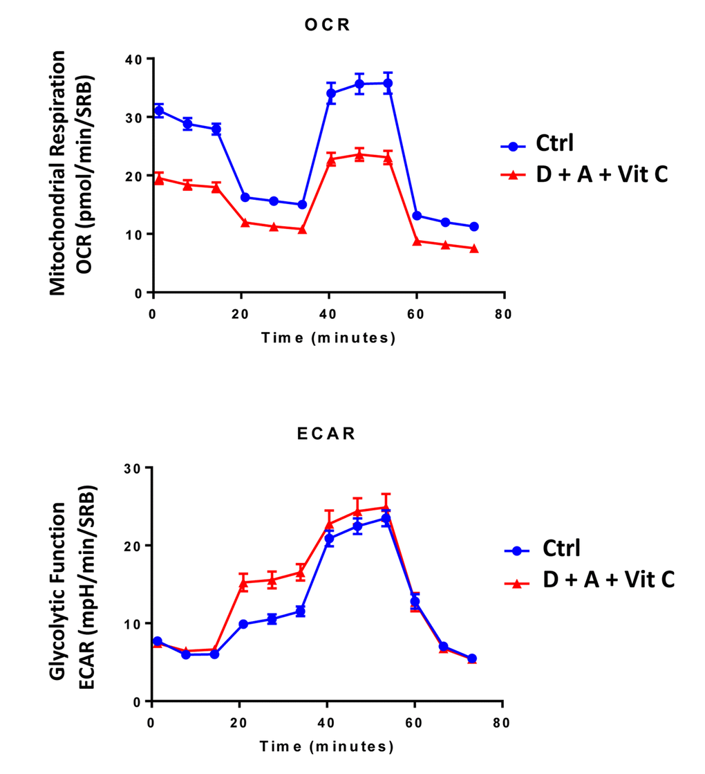 Real-time oxygen consumption rates (OCR) and extracellular acidification rates (ECAR) rates in MCF7 cells were determined using the Seahorse Extracellular Flux (XFe96) analyzer (Seahorse Bioscience, USA) [29–31]. Briefly, 1.5 x 104 cells per well were seeded into XFe96 well cell culture plates, and incubated overnight to allow cell attachment. Then, cells were treated with antibiotics and/or with Vitamin C for 72h. Vehicle-alone control cells were processed in parallel. After 72 hours of incubation, cells were washed in pre-warmed XF assay media (or for OCR measurement, XF assay media supplemented with 10mM glucose, 1mM Pyruvate, 2mM L-glutamine and adjusted at 7.4 pH). Cells were then maintained in 175 µL/well of XF assay media at 37°C, in a non-CO2 incubator for 1 hour. During the incubation time, we loaded 25 µL of 80 mM glucose, 9 µM oligomycin, and 1M 2-deoxyglucose (for ECAR measurement) or 10 µM oligomycin, 9 µM FCCP, 10 µM rotenone, 10 µM antimycin A (for OCR measurement), in XF assay media into the injection ports in the XFe96 sensor cartridge. Measurements were normalized by protein content (SRB assay). Data sets were analyzed using XFe96 software and GraphPad Prism software, using one-way ANOVA and Student’s t-test calculations. All experiments were performed in quintuplicate, three times independently.