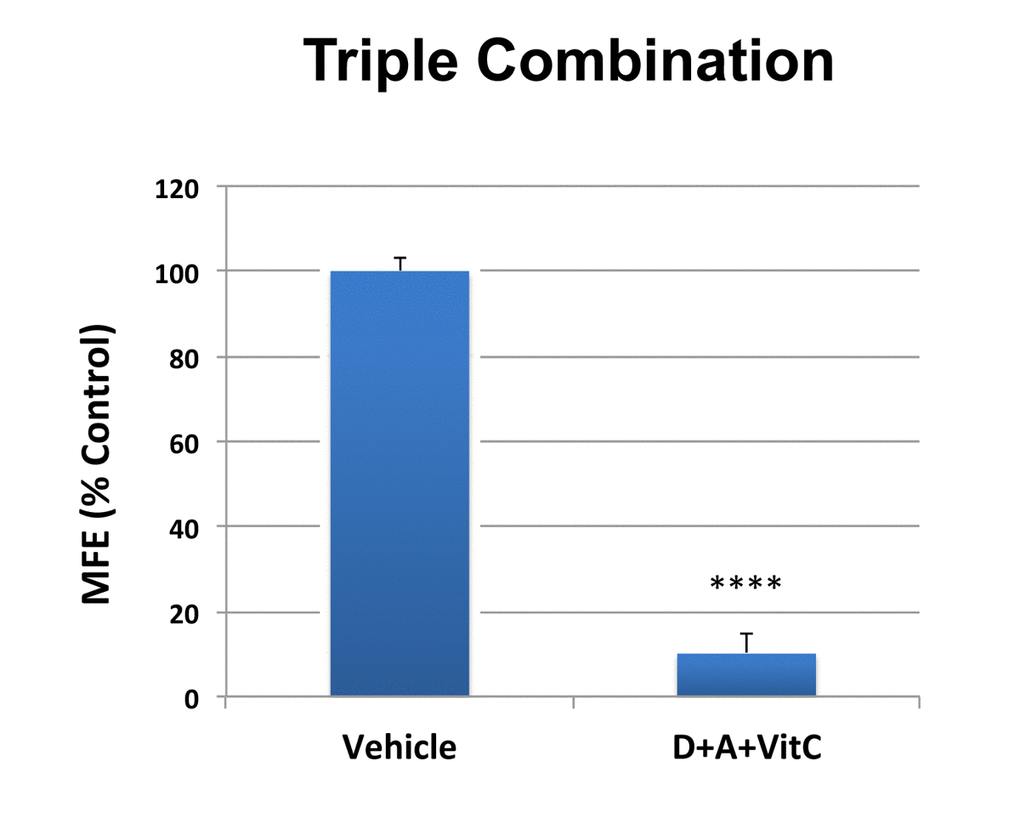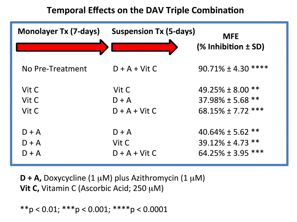 Figure 13 shows that 7 days of pre-treatment with either Vitamin C alone or Doxycycline Plus Azithromycin (D + A), rendered the DAV triple combination significantly less effective. Therefore, it appears that to achieve maximal impact, all three components of the DAV triple combination of Doxycycline (1 μM), Azithromycin (1 μM) and Vitamin C (250 μM), should be administered at the same time.