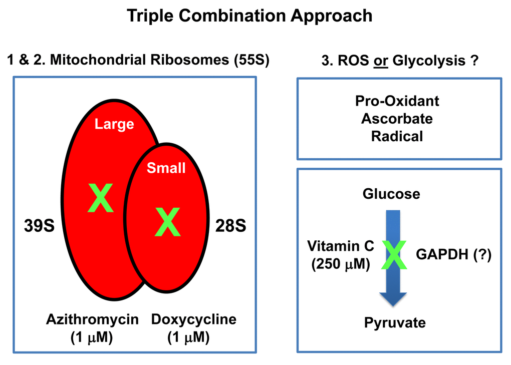 Combining two inhibitors of mitochondrial protein translation, with a pro-oxidant: Doxycycline and Azithromycin Plus Vitamin C (DAV)