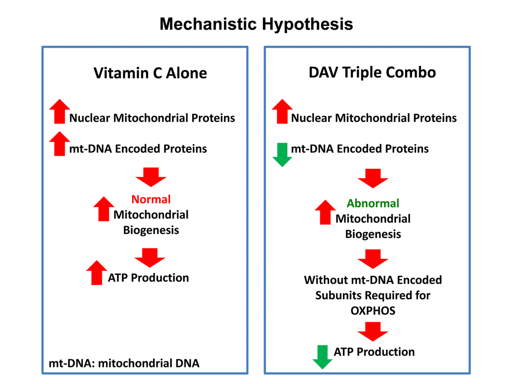 Based on the mechanism(s) underpinning the strong effectiveness of the triple combination, other pro-oxidants could also be potentially substituted for Vitamin C. As many current chemotherapeutic agents, as well as targeted radiation, all kill cancer cells, via their pro-oxidant actions, then combined inhibition of mitochondrial protein translation could be used as an add-on to conventional therapy and would be predicted to improve their efficacy. However, Vitamin C clearly has fewer side effects and a better safety profile than most standard chemotherapeutic agents. Additional experimentation will be required to further test this intriguing hypothesis.