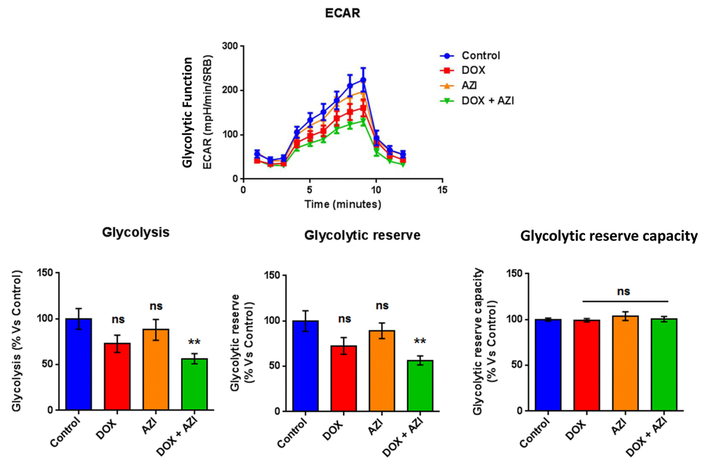 To evaluate if the inhibitory effects on mammosphere formation of this double combination is related to mitochondrial function, we next examined the metabolic profile of MCF7 cell monolayers pre-treated with the combination of 1 μM Doxycycline and 1 μM Azithromycin or with the same drugs alone for 3-days. Interestingly, the rates of both oxidative mitochondrial metabolism and glycolysis were significantly reduced by the DOX-AZI combination pre-treatment, as assessed using the Seahorse XFe96 analyzer. This resulted in significant reductions in respiration (basal and maximal), as well as reduced ATP levels (Figure 2). Similarly, both glycolysis and glycolytic reserve were decreased by the DOX-AZI combination (Figure 3). Finally, as seen in Figure 4, MCF7 cancer cells were shifted from a highly energetic profile to a metabolically quiescent state. However, the combination of 1 μM Doxycycline with 1 μM Azithromycin is initially non-toxic under anchorage-independent growth conditions (Figure 5).