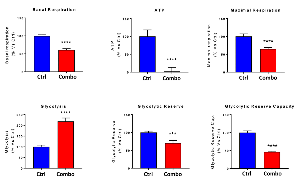 Next, we evaluated the potential inhibitory effects of the DAV triple combination on mitochondrial function, by determining the metabolic profile of MCF7 cell monolayers pre-treated with a combination of 1 μM Doxycycline, 1 μM Azithromycin and 250 μM Vitamin C for 3-days. Remarkably, the rate of oxidative mitochondrial metabolism was reduced by >50% and ATP levels were drastically reduced (by >90%), as assessed using the Seahorse XFe96 analyzer. Overall, this resulted in significant reductions in both basal and maximal respiration (Figures 7 and 8). In contrast, glycolysis was increased, while glycolytic reserve was decreased by the DAV triple combination (Figures 7 and 8).