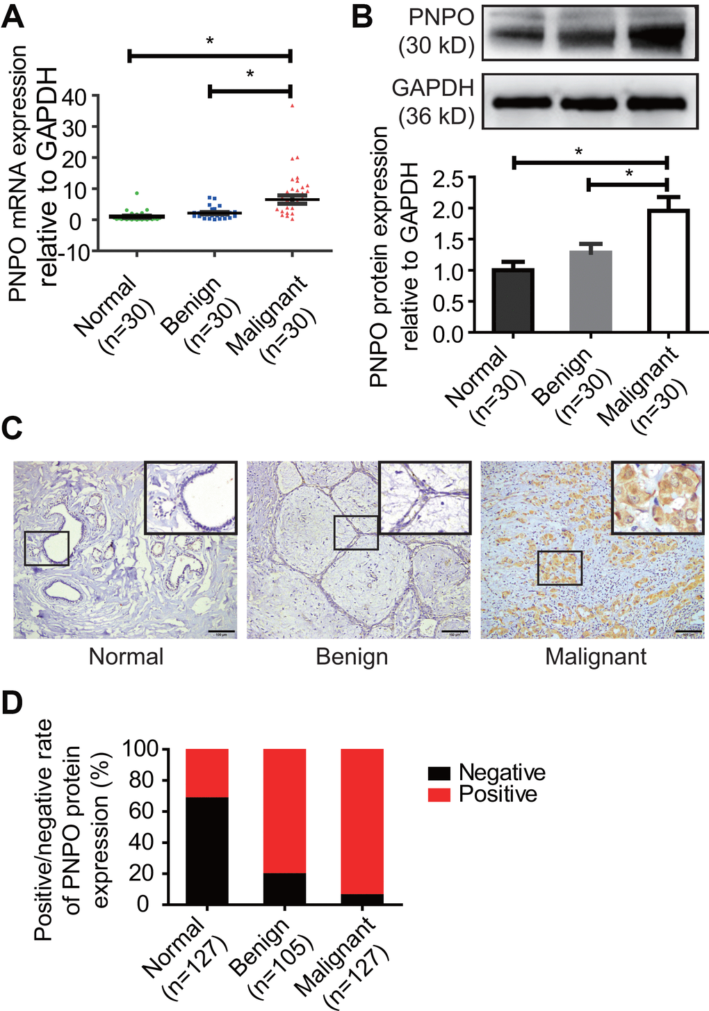 All the breast tissue specimens underwent pathological examination after surgery in the Department of Pathology, Jinshan Hospital. The final diagnosis including histological grades and tumor stages were made by experienced pathologists according to the World Health Organization (WHO) classification. Paraformaldehyde-fixed paraffin-embedded tissues were sectioned, deparaffinized and dehydrated. Tissue antigen was retrieval with a citrate buffer (pH 6.0, 15 min), followed by blocking endogenous peroxidase activity with 3% H2O2 and 10% goat serum, respectively, for 30 min at room temperature. Rabbit anti-PNPO primary antibody (dilution 1:400; Sigma) was added to the slides and incubated overnight at 4°C. HRP-conjugated goat anti-rabbit secondary antibody (dilution 1:500; Shenggong) was added and incubated for 1 h at room temperature, followed by counterstaining the tissue with hematoxylin. The results were determined using a staining index (SI) as described previously [4].