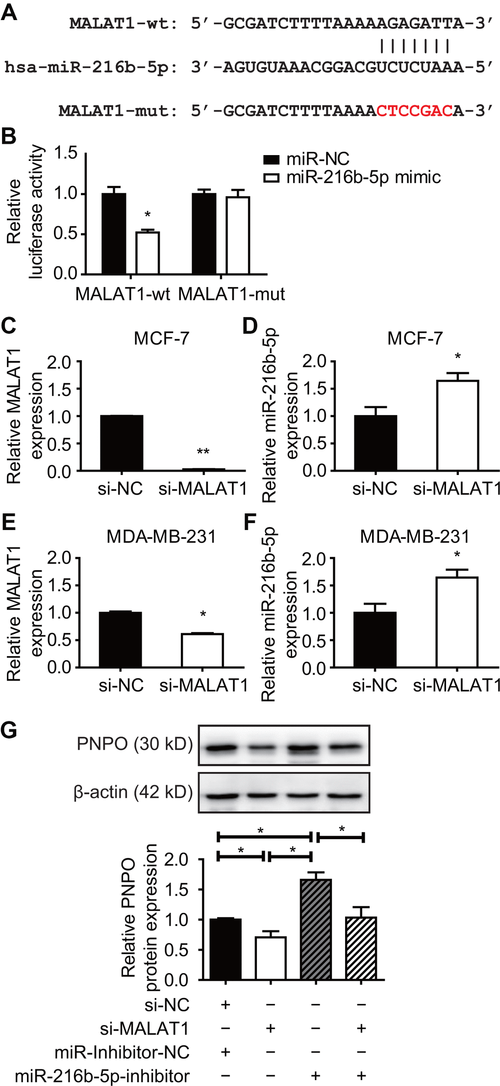 An MRE sequence was identified in the MALAT1 transcript (MALAT1-wt) which was mutated from AGAGATT to CTCCGAC (MALAT1-mut) (Figure 11A). The dual-luciferase reporter assay showed a reduced luciferase activity in HEK-293T cells transfected with MALAT1-wt plasmid and miR-216b-5p mimics for 48 h and the interaction between MALAT1 and miR-216b-5p was abolished in cells transfected with MALAT1-mut plasmid (Figure 11B). The expression of MALAT1 was knocked down (Figure 11C), while miR-216n-5p was increased (Figure 11D), after MALAT1-siRNA transfection in MCF-7 cells. The same effect of MALAT1-siRNA was observed in MDA-MB-231 cells (Figure 11E and 11F). Next, a rescue experiment was applied. HEK-293T cells were treated with si-NC plus miR-inhibitor-NC, si-MALAT1 along, miR-216b-5p along, or si-MALAT1 plus miR-216b-5p for 48 h and PNPO protein was detected by Western blot. Knockdown of MALAT1 resulted in a decreased of PNPO expression, whereas the inhibition of miR-216b-5p resulted in an increase of PNPO expression (Figure 11G). The effect of MALAT1-siRNA on PNPO expression was slightly abolished in the presence of miR-216b-5p inhibitors. These data suggest that PNPO in breast cancer cells is regulated at least in part through the MALAT1/miR-216b-5p/PNPO axis.