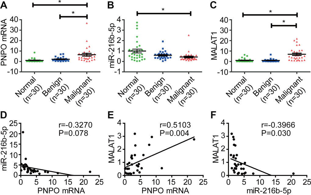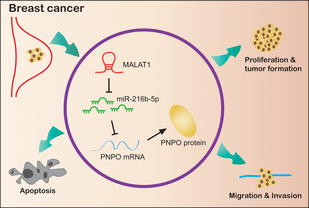 In this study, the expression and function of PNPO were examined in patients with IDC and breast cancer cells. Particularly, a regulatory mechanism of the MALAT1/miR-216b-5p/PNPO axis was investigated. Whether PNPO expression is associated with clinicopathological features of IDC was also explored.