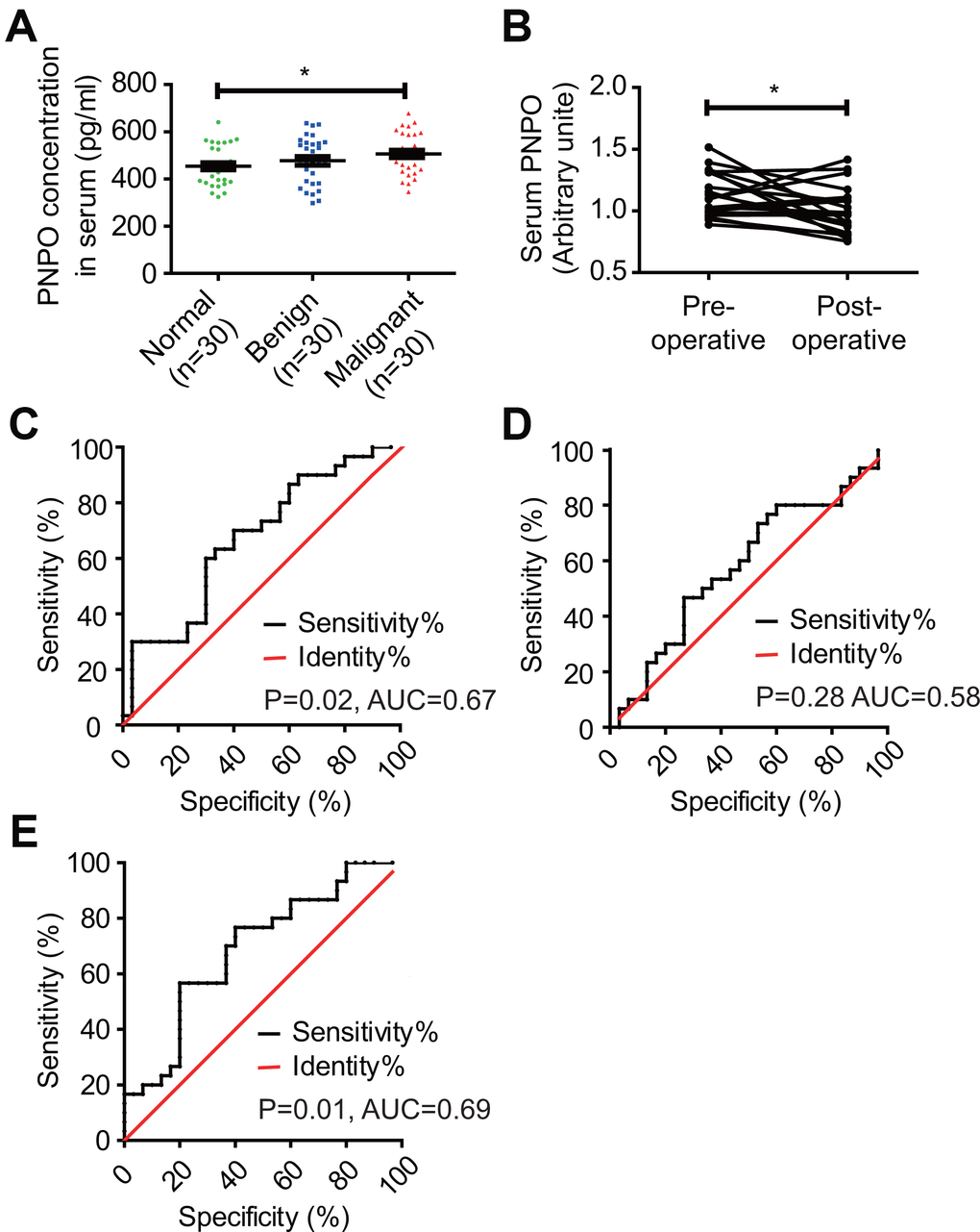 PNPO concentration was higher in patients with IDC than in women without tumor and patients with fibroadenoma (Figure 2A). The average concentrations of PNPO in the serum of IDC patients, the healthy controls, and patients with benign tumor were 506.37, 453.97, and 477.05 pg/ml, respectively. The relative levels of serum PNPO in matched samples were decreased after surgery in patients with IDC (P < 0.05) (Figure 2B), but no significant correlation was found between the level of serum PNPO and clinicopathological features (Supplementary Table 2). Next, the receiver operating characteristic (ROC) curves of serum PNPO was calculated. The ROC curve showed that an area under the curve (AUC) for PNPO is 0.67 with 95% confidence intervals (CIs) of 0.5330 to 0.8070 (P = 0.02) (Figure 2C). The concentration of serum COL5A1 in IDC patients, the benign tumor patients, and the healthy controls was 40.42, 43.08, and 42.24 μg/L, respectively. The AUC for COL5A1 was 0.58 with 95% CIs of 0.4346 to 0.7276 (P = 0.28) (Figure 2D). However, the AUC for PNPO combined with COL5A1 was 0.69 CIs of 0.553 to 0.8247 (P = 0.01) (Figure 2E).