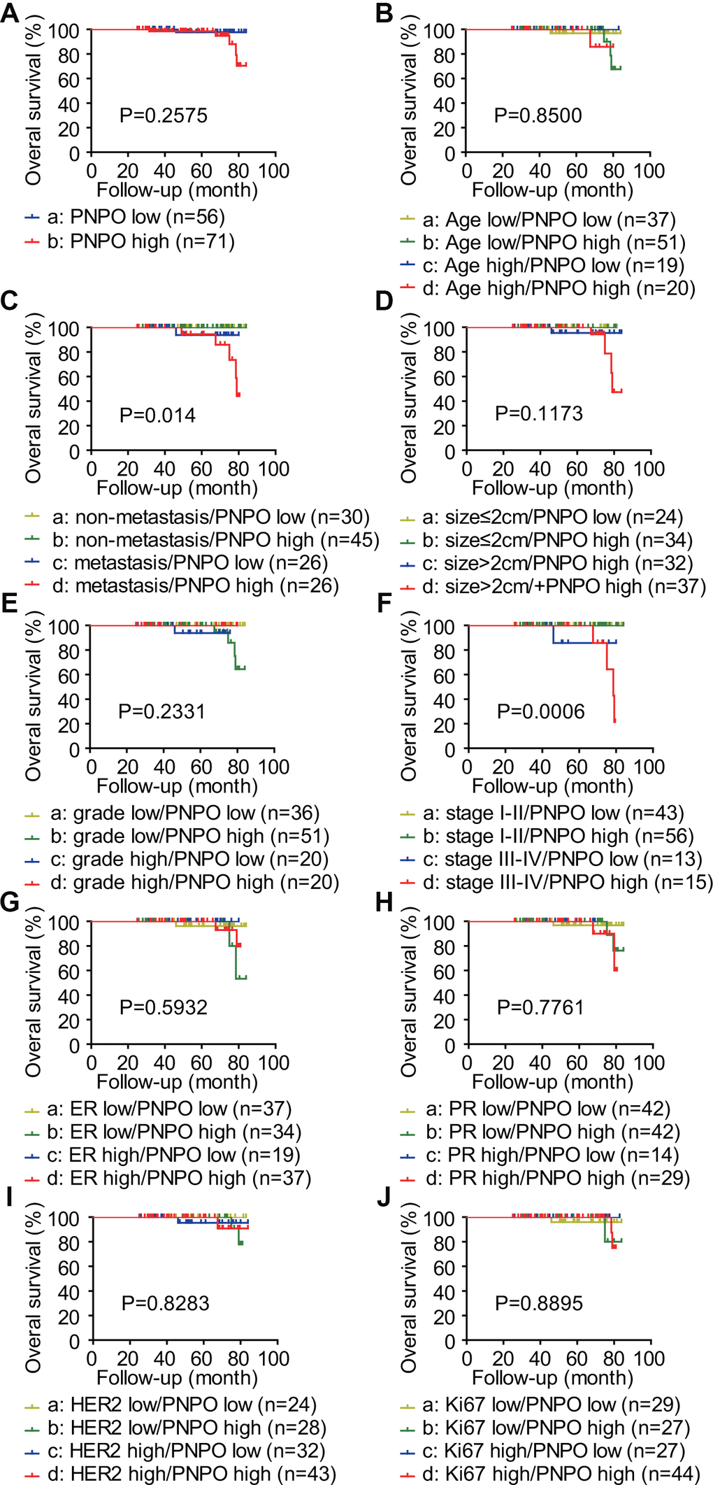 The overexpression of PNPO was observed in patients with IDC. Although the log-rank test showed that OS with the factors of metastasis and clinical stage was influenced by PNPO expression level, the univariate and multivariate analyses for the outcome of OS showed less strength of the link between PNPO and clinical prognosis. These data suggest that PNPO may be a progression marker rather than an independent prognostic factor. Because the sample size used in the current study is relatively small and the time of observation for OS is short, these outcomes may not really reflect the clinical importance of PNPO. Accumulated data analyses will be needed in the future.