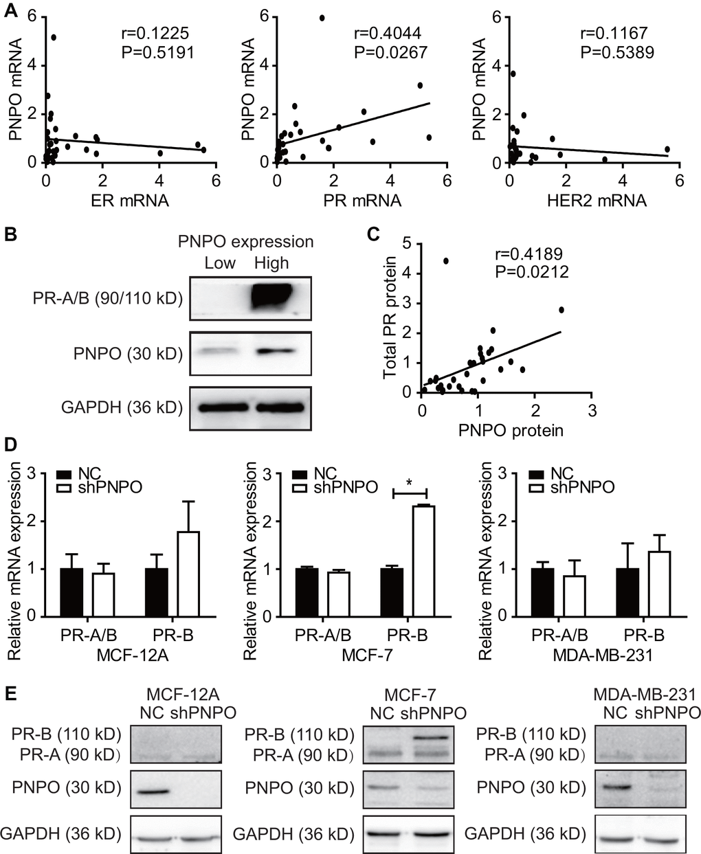 Patients with ER-positive and PR-positive breast cancer are responsible for hormone-therapies [19]. However, there are limited treatment options for triple-negative breast cancer (ER-/PR-/HER2-) compared with triple-positive one [20]. In human IDC tissue study, we observed the positive correlation between PNPO and ER (P = 0.040), not PR (P = 0.061), at protein level (n=127) detected by IHC and the positive correlation between PNPO and PR at mRNA and protein levels (both n = 30; P < 0.05) detected by qRT-PCR and Western blot, respectively. The different results observed in this study were most likely due to the utilization of the different methods and small sample size, and therefore, an increase in the sample size may be needed in the subsequent study. The current study also examined the effect of PNPO on PR expression in hormone-sensitive and -insensitive breast cancer cell lines. It has been shown that MCF-12A and MDA-MB-231 are ER-/PR-/HER2- cell lines, whereas MCF-7 is ER+/PR+/HER2- cell line [21]. Most interestingly, we found that knockdown of PNPO increased the expression of PR-B isoform in MCF-7 cells, not in MDA-MB-231 cells, suggesting that PNPO may influence the hormone sensitivity of breast cancer cells. Because of the vast heterogeneity in breast cancer and because the regulation of PR due to PNPO knockdown in MCF-7 cells remains unknown, along with this line, further study may be needed.