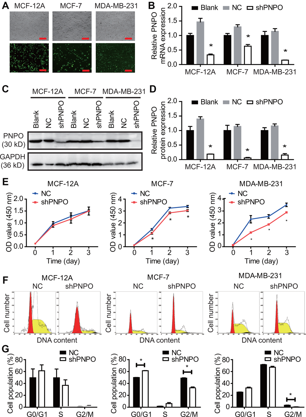 The effect of PNPO on cellular behavior was examined by the loss-of-function approach. Immunofluorescence microscopy showed the efficiency of lentiviruses infection with GFP and PNPO-shRNA in MCF-12A, MCF-7, and MDA-MB-231 cells and more than 90% of cells were GFP-positive (Figure 5A). PNPO was significantly knocked down by PNPO-shRNA at the mRNA (Figure 5B) and protein levels (Figure 5C and 5D). Using a CCK8 assay, a decrease of cell viability was observed in breast cancer cells MCF-7 and MDA-MB-231 after PNPO-shRNA infection (Figure 5E). Flow cytometry showed that PNPO knockdown increased G0/G1 phase in MAF-7 cells and decreased G2/M phase in MCF-7 and MDA-MB-231 cells (Figure 5F and 5G).